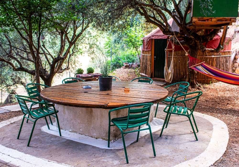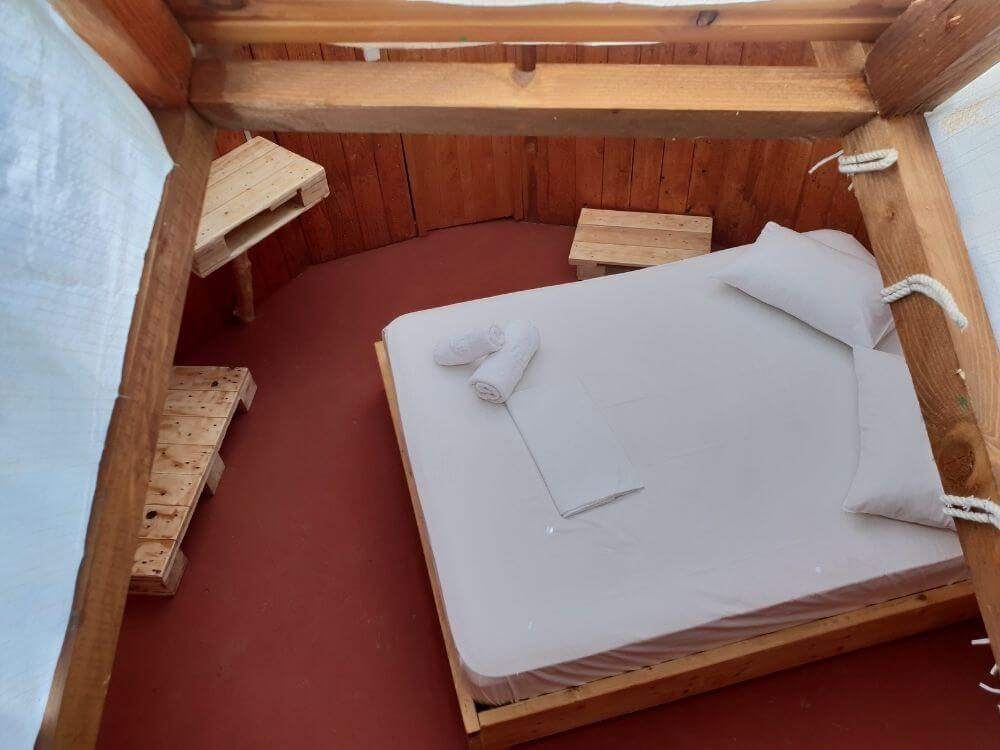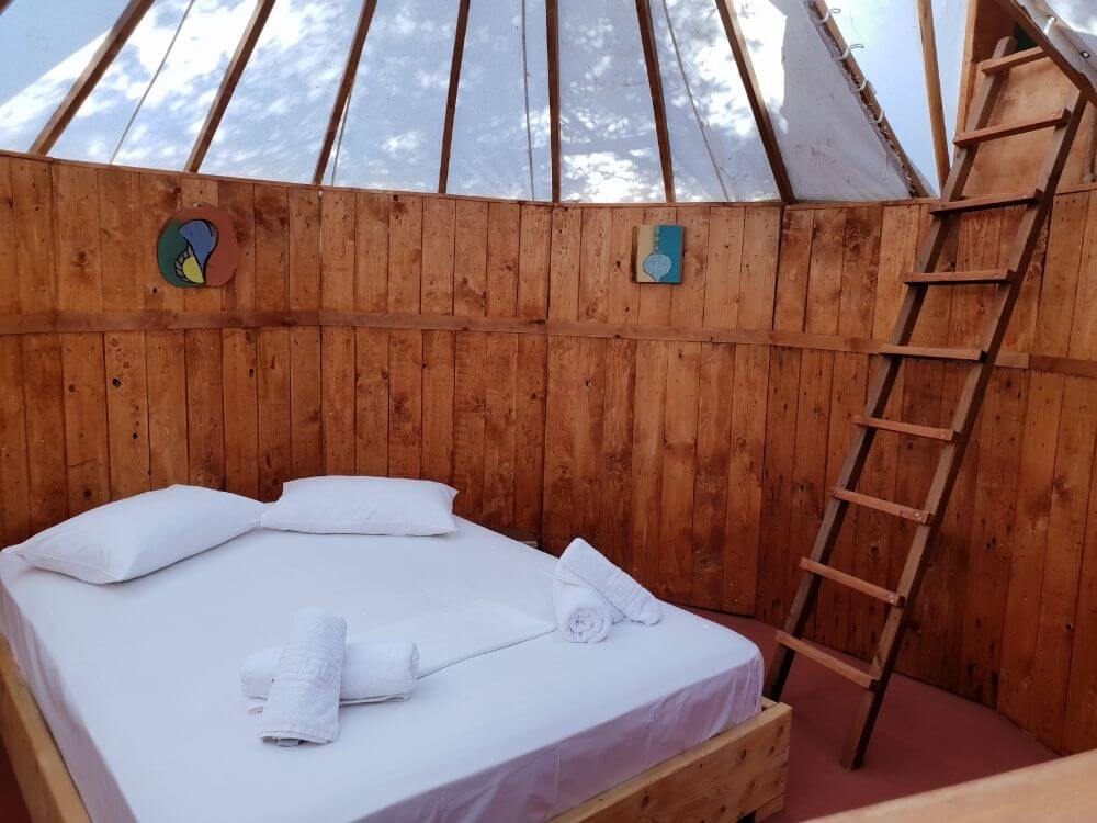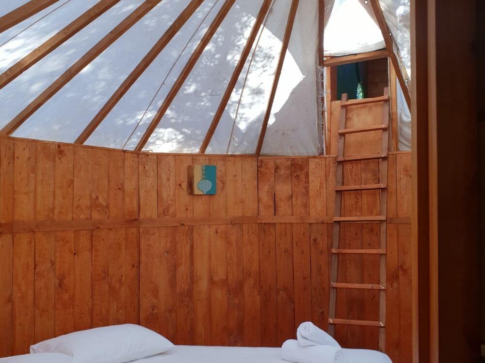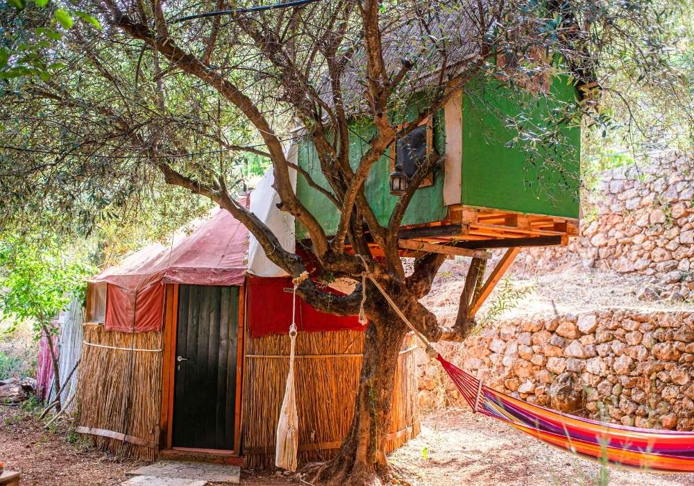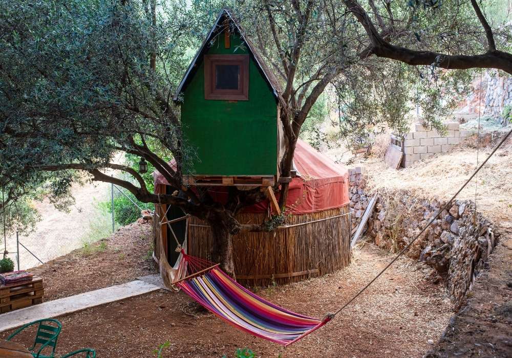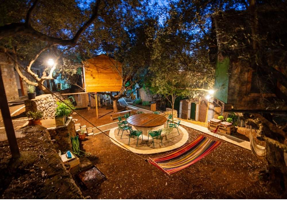Art Farm – Agroktima Marini is located 14 km outside Kalamata, in the Peloponnese. It is just 2 hours and 30 minutes from Athens and is a model cultural farm that highlights the agricultural and cultural heritage of the region and aims to inform, educate and entertain visitors. In an area of 5,500sq.m. the Art Farm combines the uniqueness of nature and human inspiration, offering experiences to young and old alike. Art Farm is located near the small village of Megali Madinia, which is both a summer and winter destination. You can explore the area to learn more about the Greek tradition, while at the Farm, 4 km from the beach, you can relax and enjoy the tranquility of nature. The Art Farm’s tree houses-oil huts, made of reeds, are the trademark of the Farm. The tree-house “Yurt Tree House Combo” is a unique shelter consisting of 1 double bed , 1 single bed, private wc and private shower. 1 of the 2 beds has access by stairs. It is designed to offer moments of stay in harmony with nature. Its purpose is to make you escape and bring you close to the experience of unique and relaxing holidays. It is ideal for those looking for a quiet place to relax. Apart from the accommodation, the farm also has a multi-purpose hall which consists of a stone amphitheater where during the summer months various cultural events are held, the main hall where various types of conferences are hosted as well as events such as weddings and christenings, while the workshops that it has are used for seminars on rural culture. At the Farm there are organic vegetable gardens and fruit trees, available during the stay. The food served consists of natural and pure local produce. The way of cooking is based on traditional Greek recipes. Meals can be served for vegetarians or vegans (please inform us in advance). At the farm you can even come with your four-legged friend, as the facilities are pet friendly and designed to accommodate your pet! In accordance with WHO guidelines, there is meticulous adherence to hygiene rules, use of masks, keeping distances, careful cleaning and disinfection of surfaces and areas, especially at contact points. All rules are important and vital for the Art Farm staff and the protection of visitors. Experience the fantastic experience of reliving your childhood memories and carefree fun!