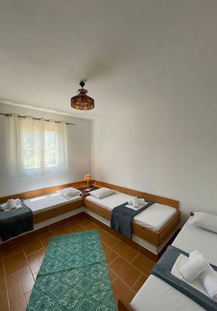 Our apartment features a separate bedroom with 3 single beds, a large living room with 3 single beds with a cozy fireplace, a fully-equipped kitchen, a private terrace, air conditioning, and Wi-Fi. This spacious accommodation is designed to provide all the comforts of home while immersing you in the natural beauty and traditions of Greece.
