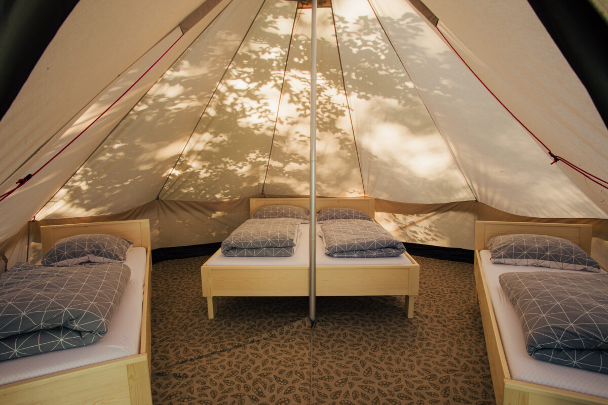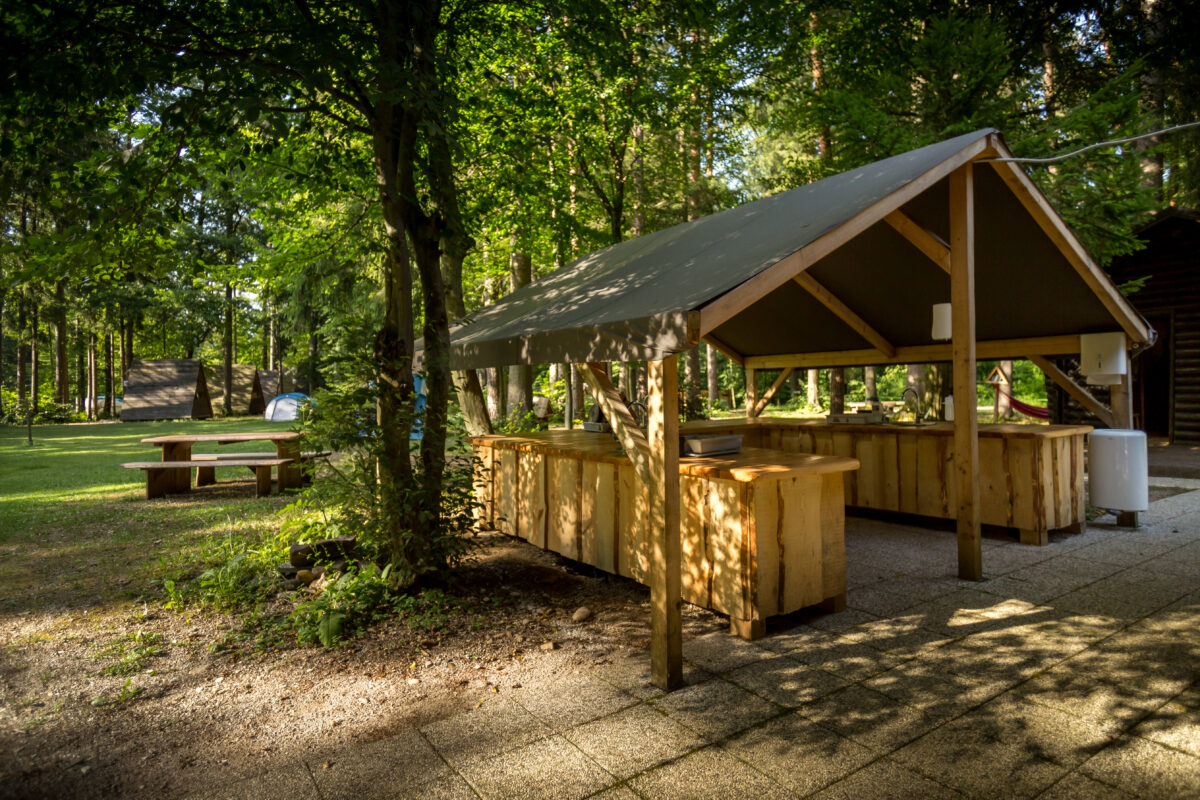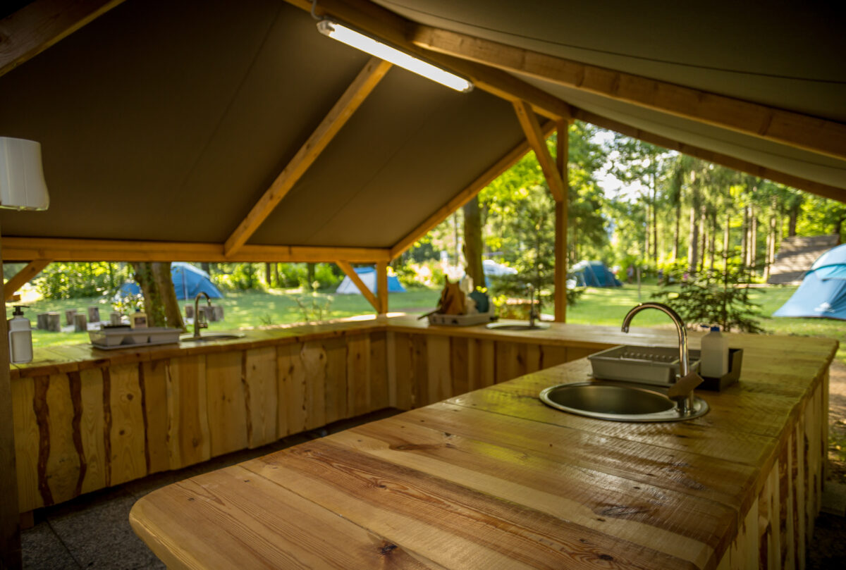 Renting an equipped family BELL tent already includes free use of our covered shared kitchen (the kitchen is fully equipped for your carefree cooking, with a covered dining room and refrigerators for storage) as well as all our other common areas and sports equipment.