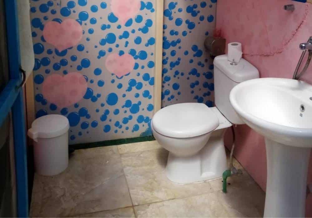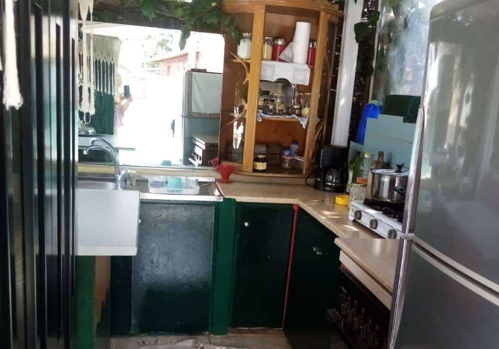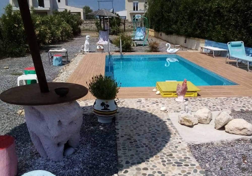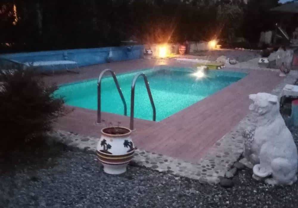 The area is surrounded by a fence and has trees and bushes, a swimming pool, a bathroom, a kitchen, a solar heater, a barbecue, and free WiFi.