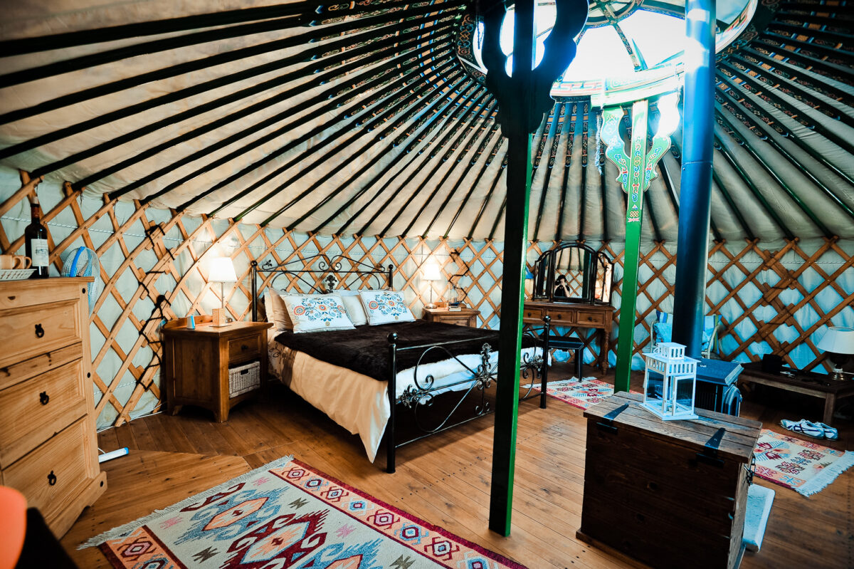 The yurt has 2 stone patios, one is roofed, with a hammock and a comfortable sitting area, the other is setup with a sofa and open for star gazing or watching the sun go down.