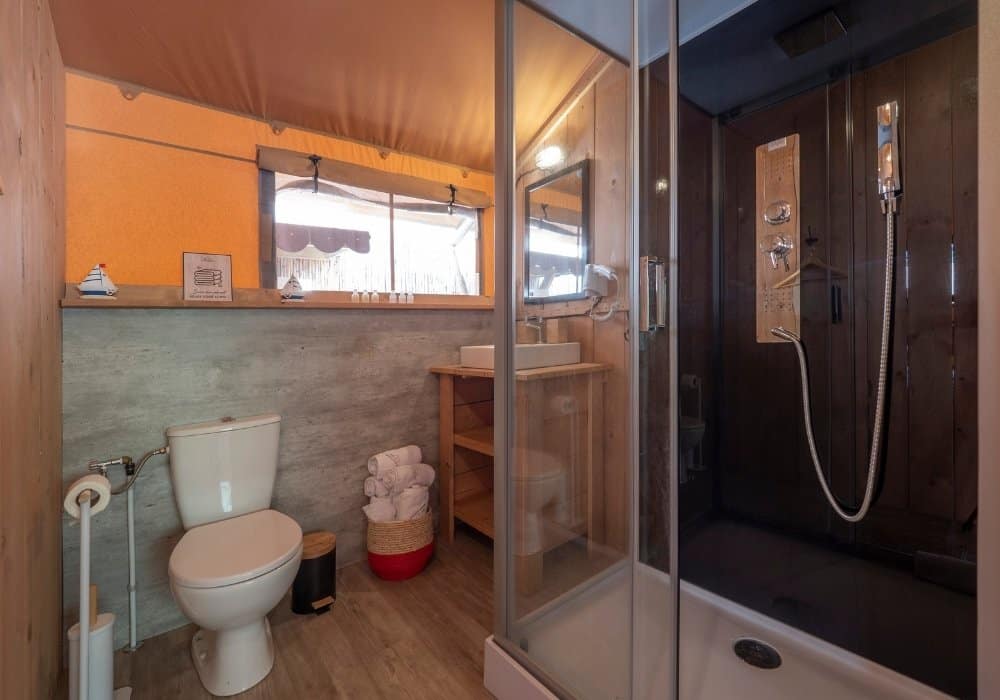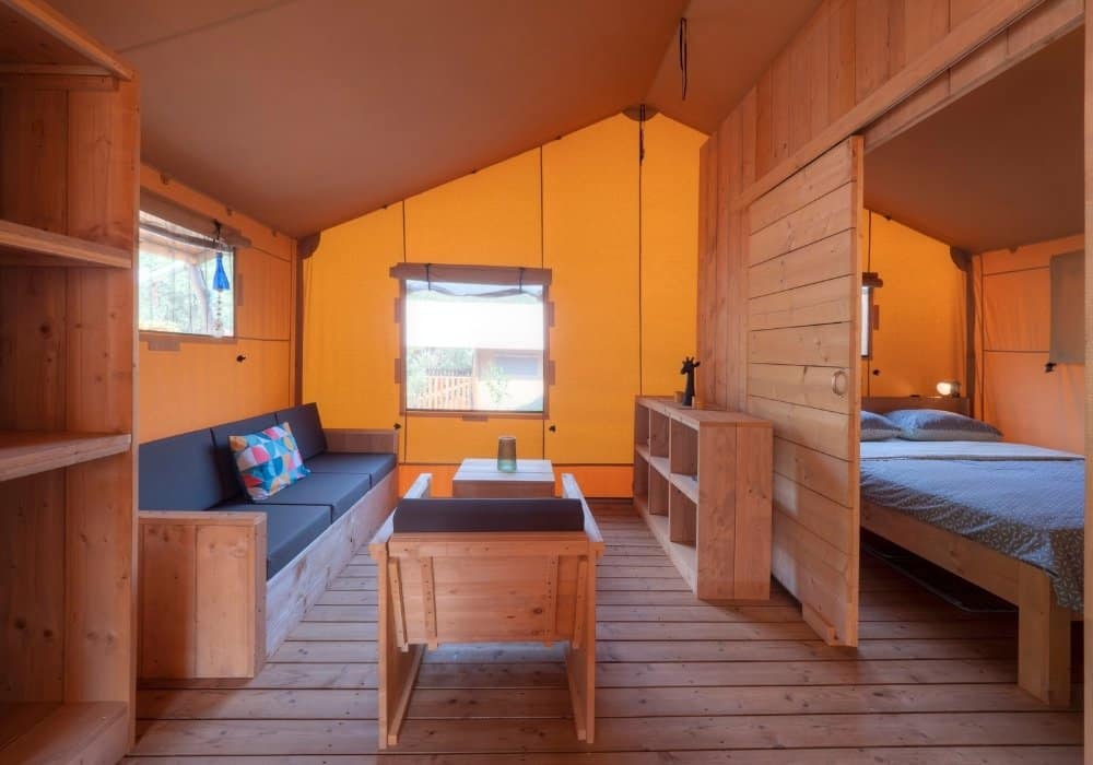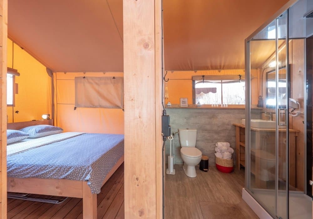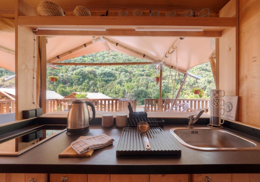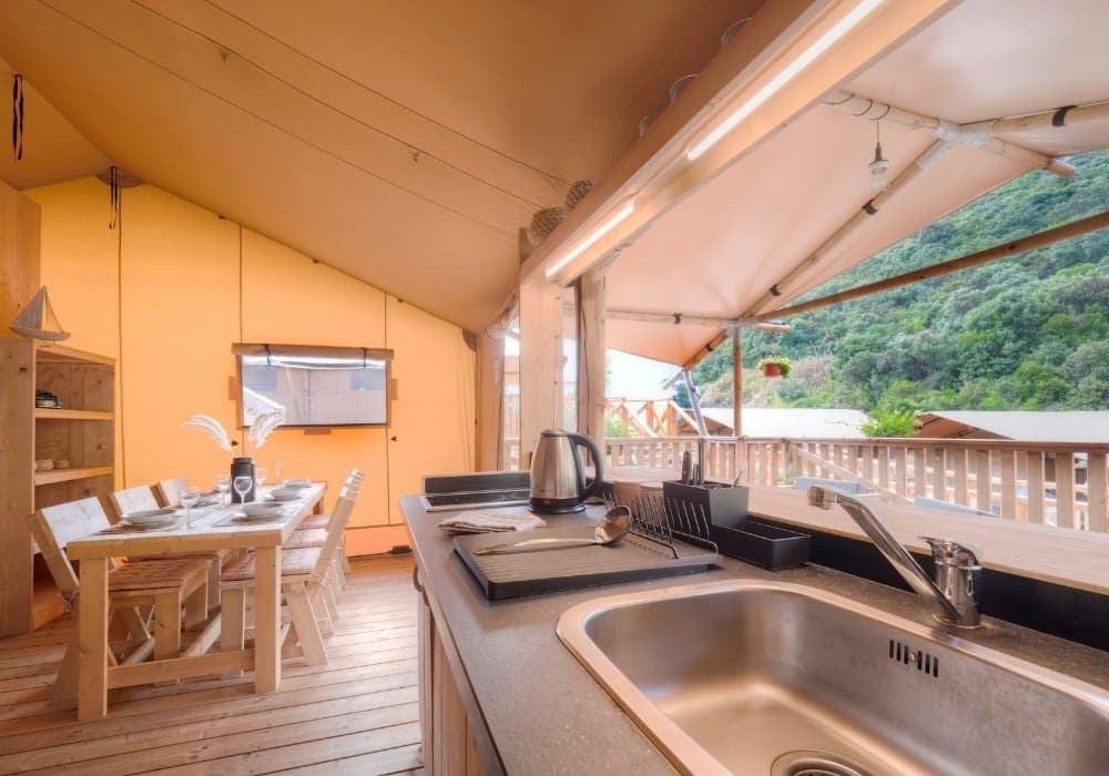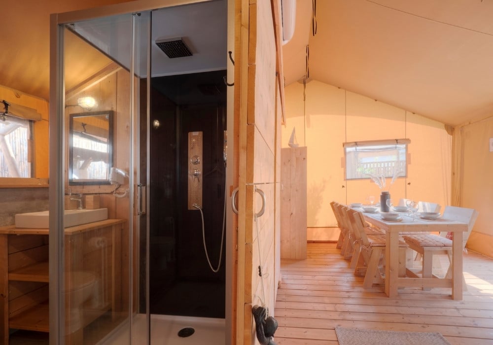 This magnificent glamping lodge, dream-like, with 63 m2 size, provides an exceptional and one-of-a-kind experience with all the comforts of a five-star hotel. With a spacious kitchen, dining area, and terrace for sunbathing or a private dinner under the stars, this cozy space can accommodate five to six people. True canvas cottage with enough room for everyone to enjoy in an elegant yet simple design, it’s great for families, couples, and groups of friends.
