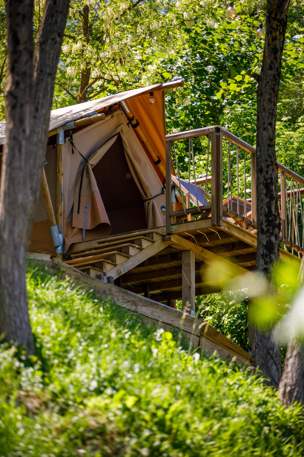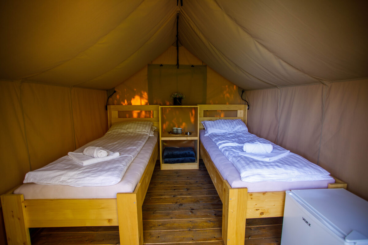 SARKLE GLAMPING TENTS are for two persons. Sparkle is perfect for those who need a practical, yet comfortable base. This is the perfect getaway for true adventures and couples looking for exciting journeys. Sparkle tent includes two beds with linens, towels and lights, plus storage shelf, mini fridge, hot water kettle and portable fan. Each offers a private terrace with sun loungers. A bathhouse including hot shower, shampoo and hair dryers, sinks and flushing toilets, is conveniently located close to your tent.