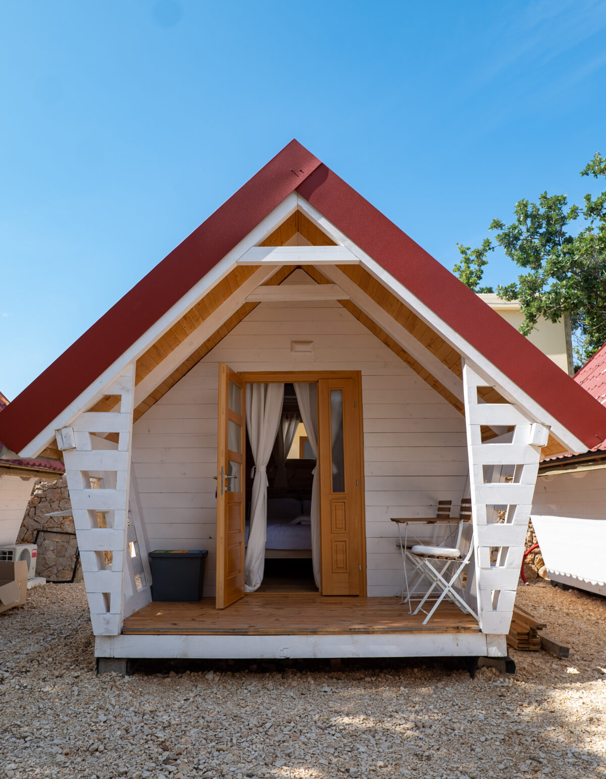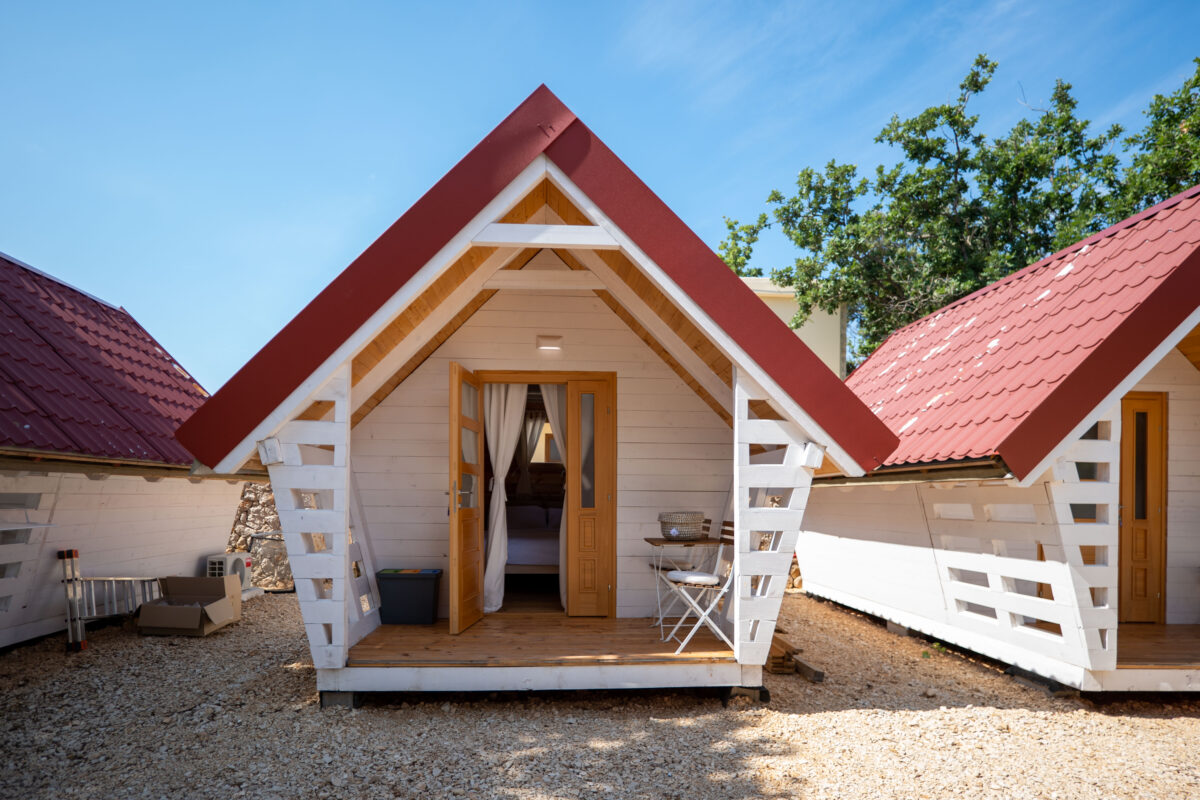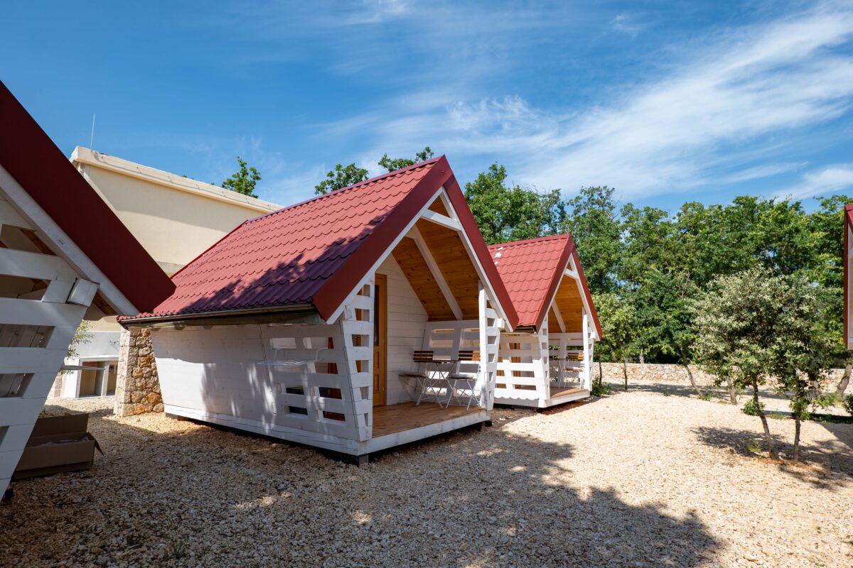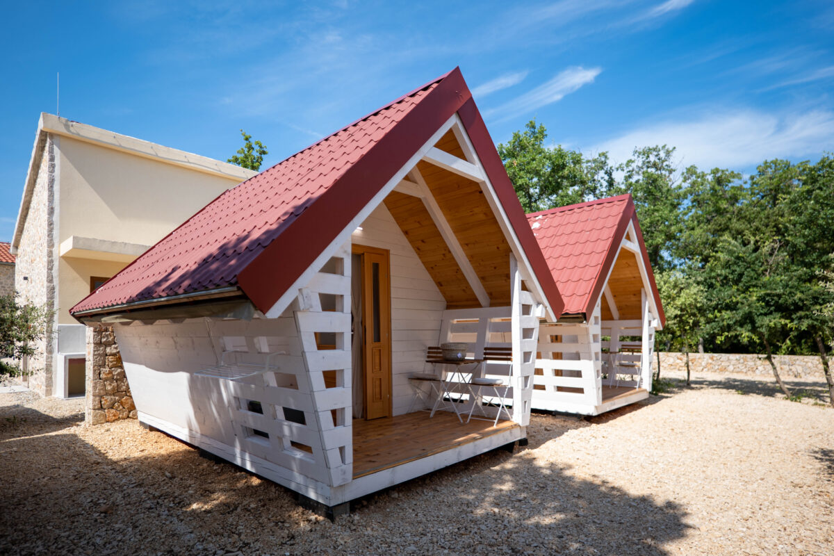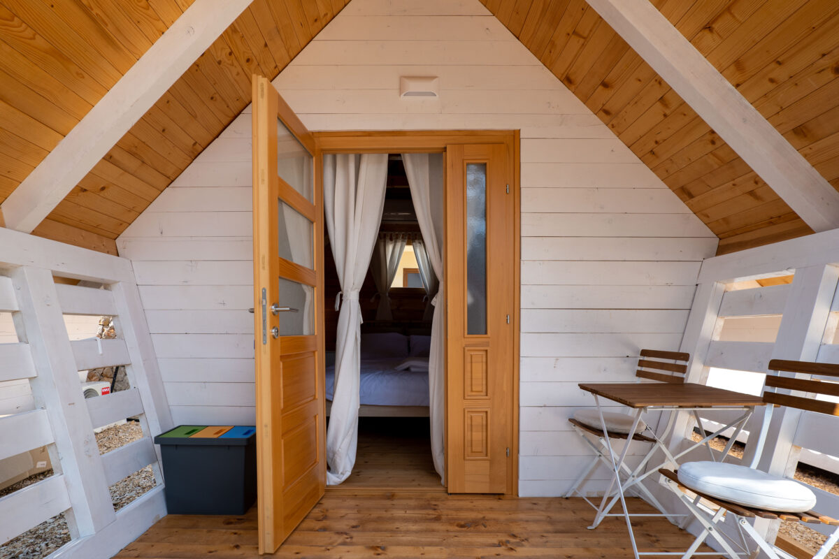 A glamping hut at Dionis Camping Zaton is a cosy nest for two.