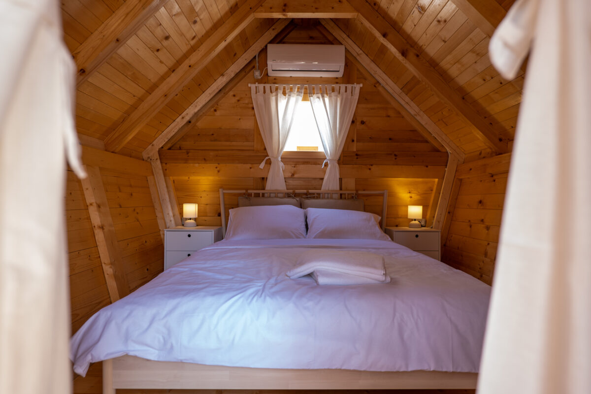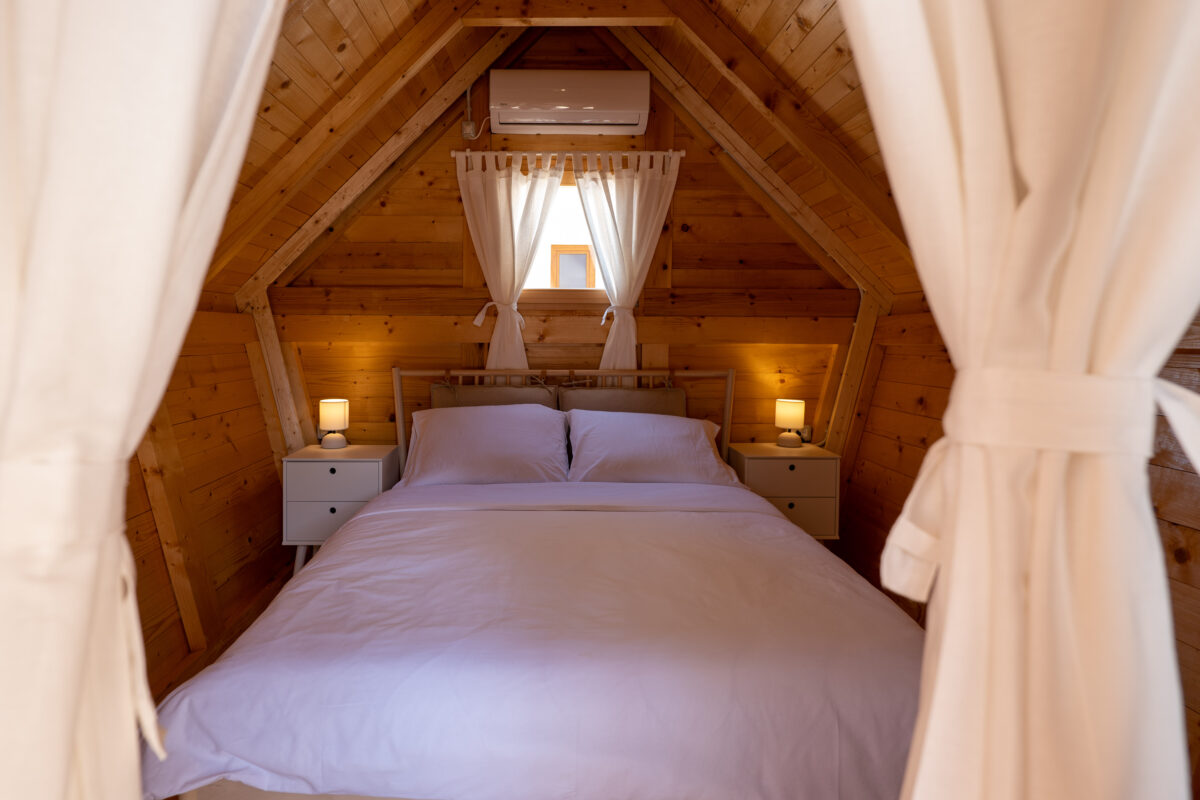 Our glamping hut is decorated for a comfortable stay, equipped with shelves, nightstands and a spacious double bed.