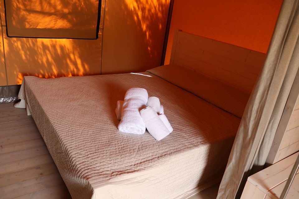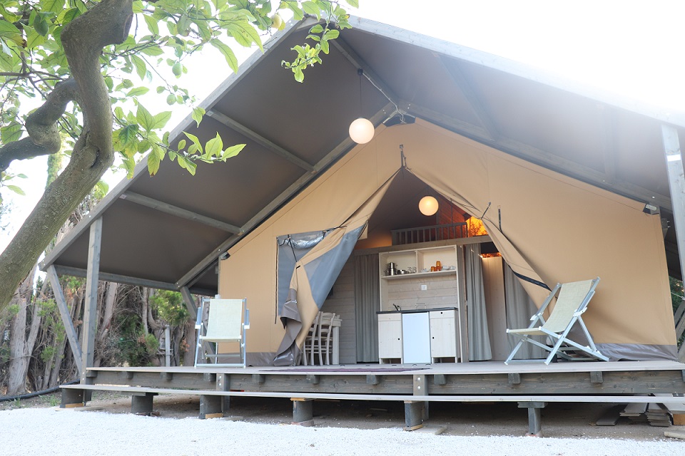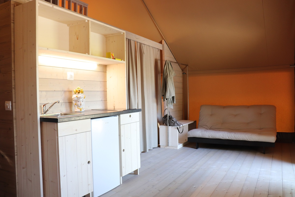 The freedom of nature, the comfort of a home, the charm of the Sicilian countryside, combined with the hospitality of the Vultaggio family. If vacation for you is synonymous with freedom and joy, if your concept of relaxation coincides with a complete immersion in nature that in every season of the year manages to fascinate, our Glamping is the ideal solution. With Agriturismo Vultaggio’s offers, camping becomes a glamorous experience. You’ll feel comfortable thanks to the services you’ll enjoy in a structure that replicates a traditional hotel room, with details and furnishing solutions taken care of in the smallest details. You will feel free to experience nature in all its fullness at your own pace: the living solutions are wooden, ecological and located in a dedicated area of the Vultaggio family estate. You will feel relaxed living an agritourism experience that gives a real contact with nature. Eco-architectures Glamping accommodations are fir-wood structures of about 50 square meters in total, with a 16-square-meter covered veranda that allows you to enjoy happy moments of relaxation contemplating the greenery of the Trapani countryside or sipping a glass of wine chosen from our selection. Furnished with custom-built wooden furniture of sober and linear design, they are perfect for a family vacation or with friends with a hint of adventure. Cover interior and exterior walls in fireproof cotton. The facilities are equipped with toilets with ceramic sink and toilet, shower cm80x120, 50-liter storage kettle. Composition: bedroom 160×190 with hangers; bedroom with 2 bunk beds 80×190 each and loft bed with hangers; living room with hangers and futon double sofa bed 160, 190; kitchenette equipped with induction hobs, sink, refrigerator, undermount; large terrace of 16 sq. m. approx.