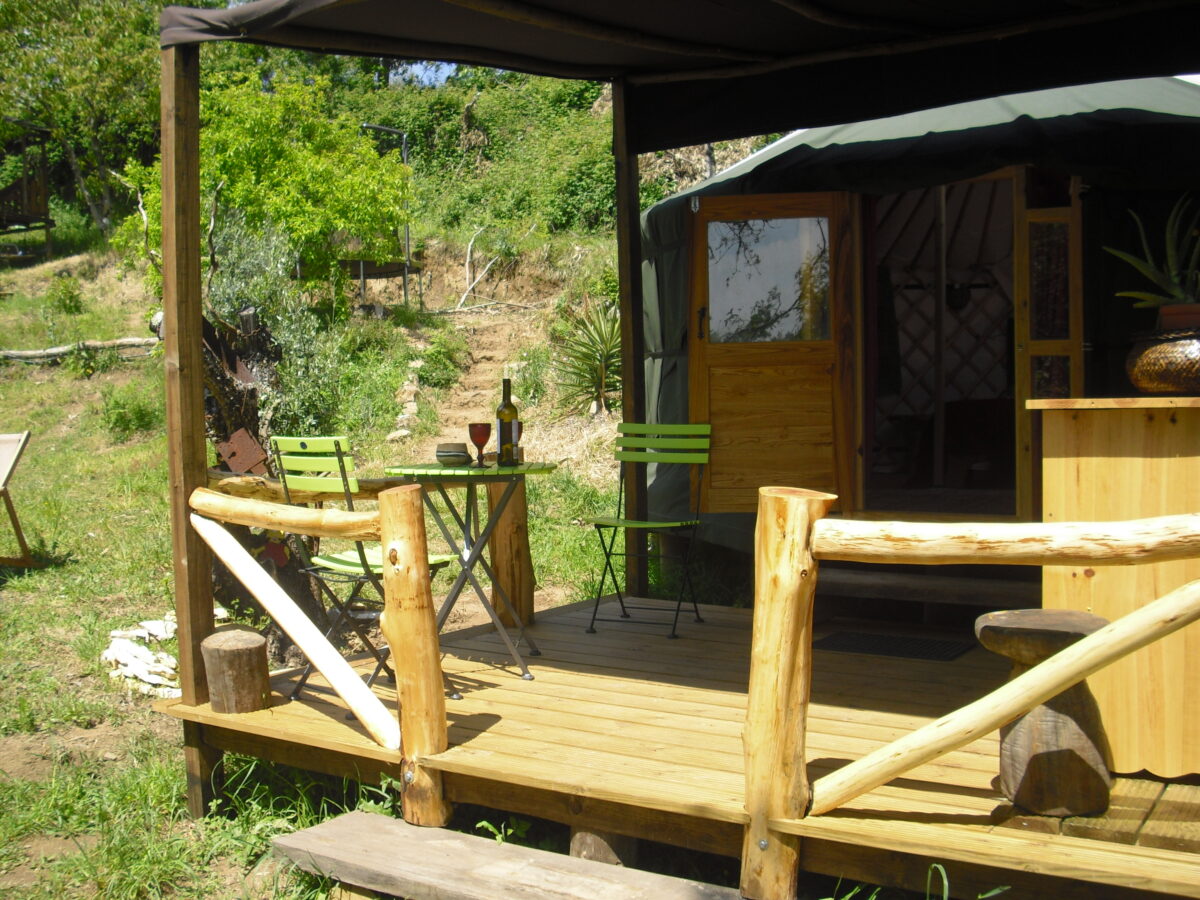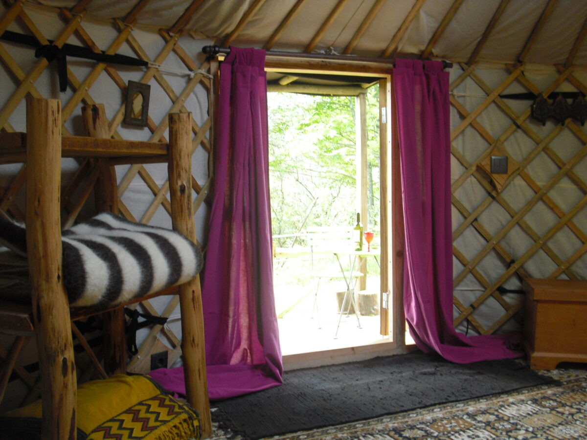 The yurt is around 4.8 meters in diameter with hand-made furniture and set on a south facing terrace of fruit, oak and chestnut trees in a space that has been carefully developed over the years to get maximum enjoyment and benefit of our woodland surroundings whilst maintaining a low impact on flora and fauna.