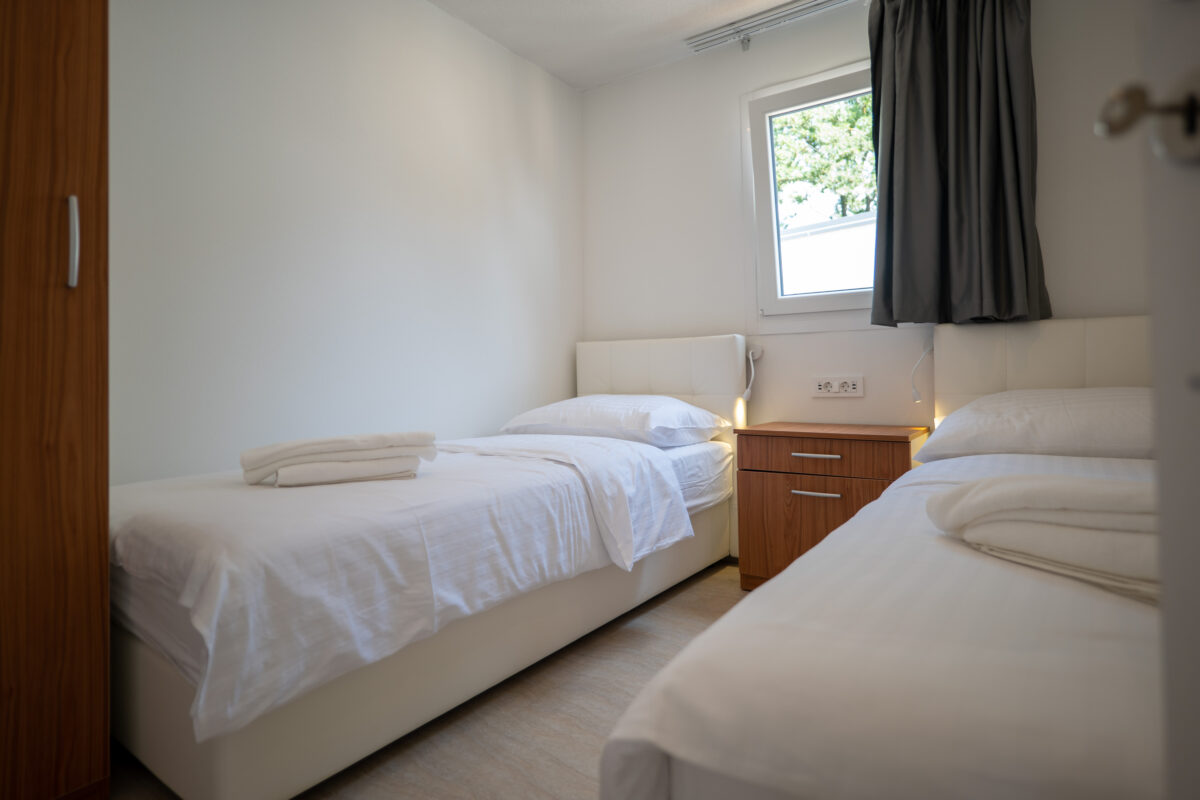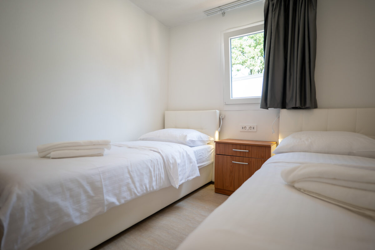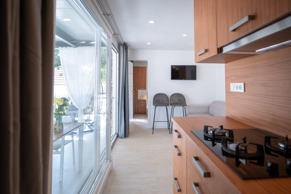 This is a spacious mobile home with a large terrace partly roofed over. It has one bedroom with a double bed and another with separate beds, two bathrooms and a fully equipped kitchen. The sofa in the living room could also be used as a bed, if not as an afternoon resting point.