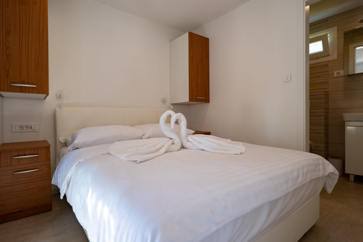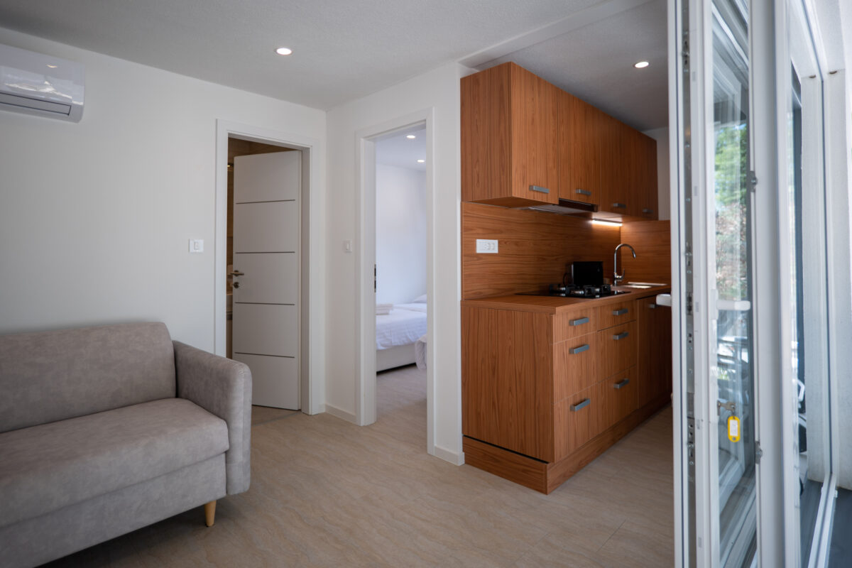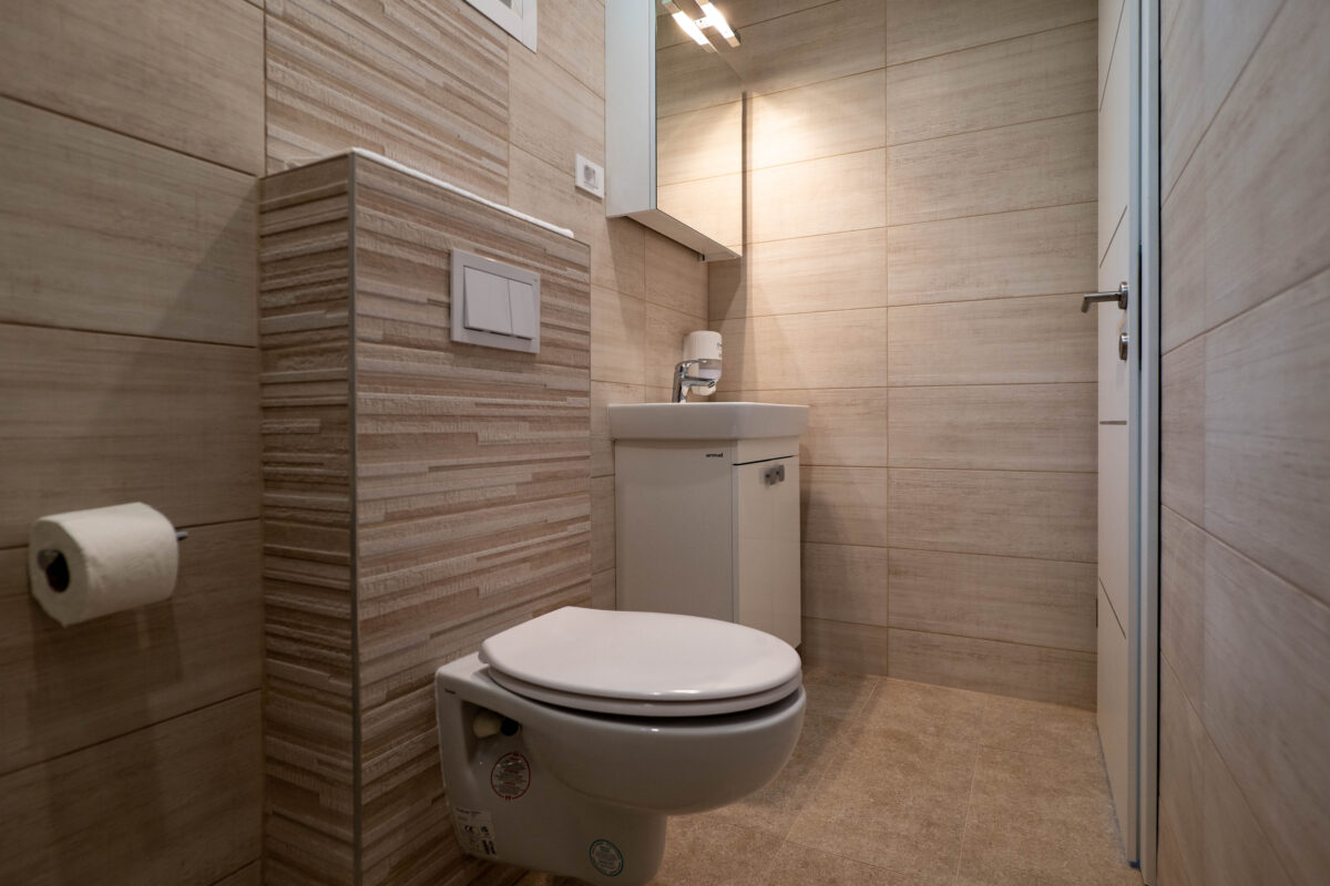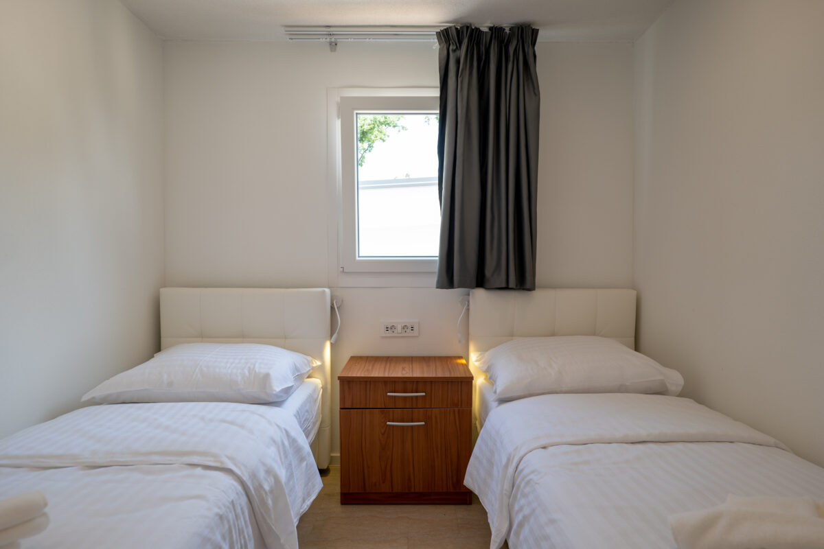 This is a spacious mobile home with a large terrace partly roofed over. It has one bedroom with a double bed and another with separate beds, two bathrooms and a fully equipped kitchen. The sofa in the living room could also be used as a bed, if not as an afternoon resting point.