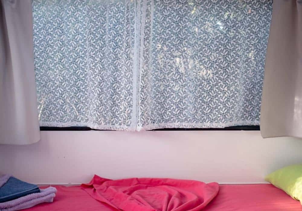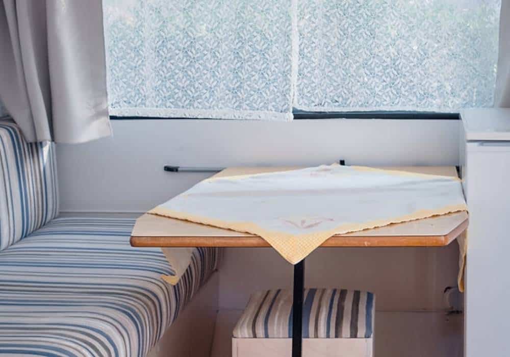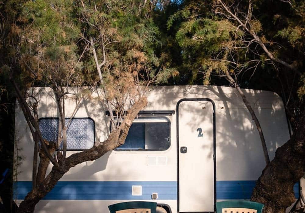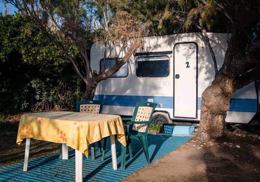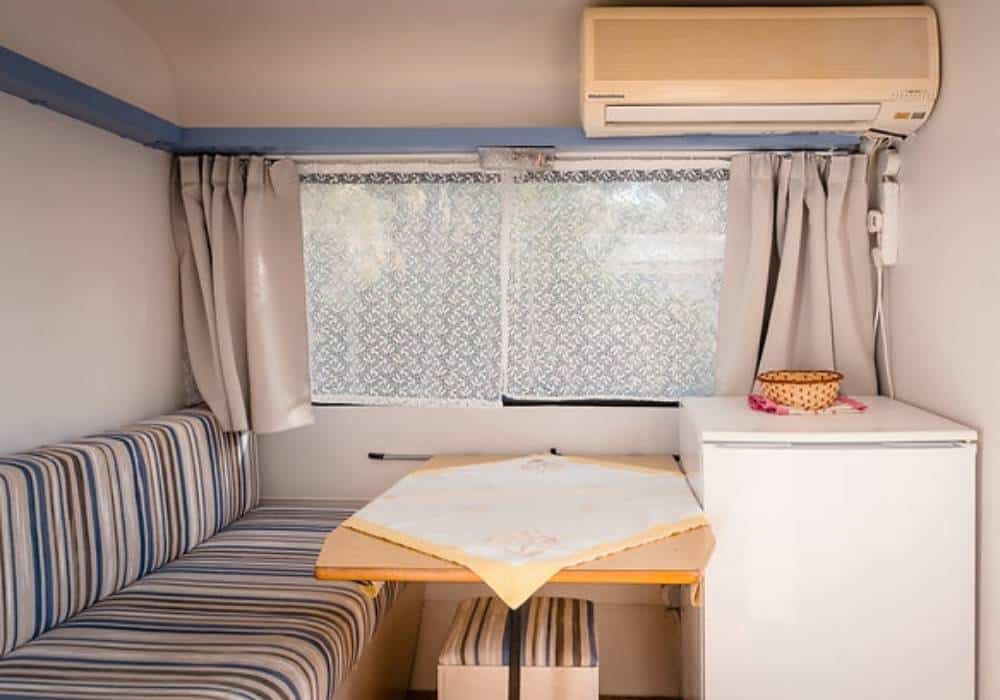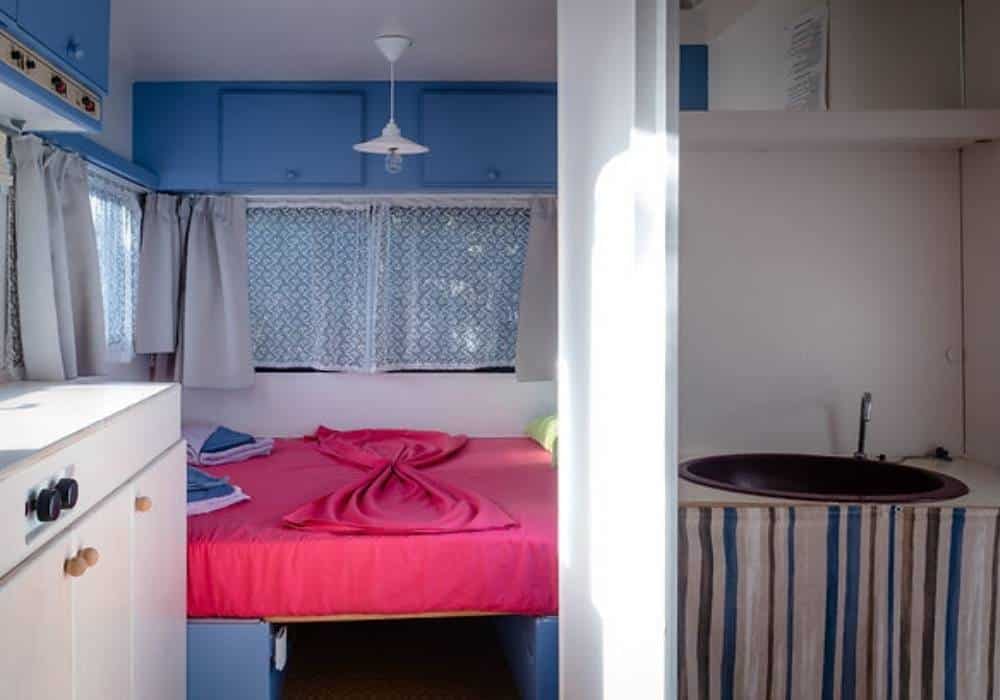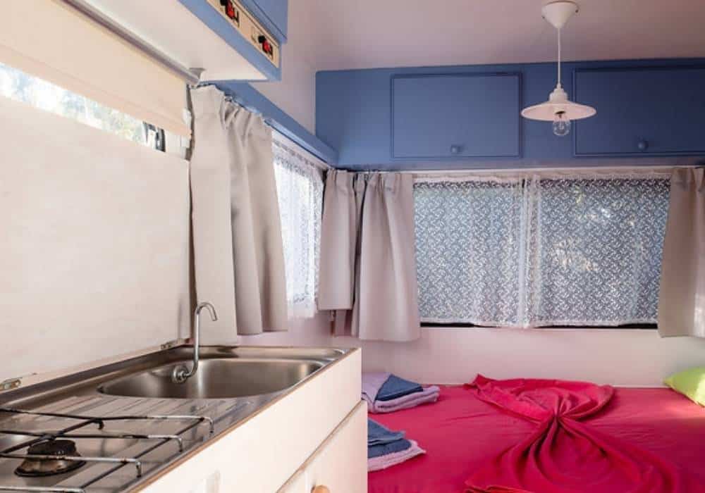 Camping Elizabeth’s modest caravans may sleep up to two people. They have one double bed, a living area with a kitchenette, towels, bed linen, air conditioning, and WiFi. A patio with a table and chairs is included with each caravan.