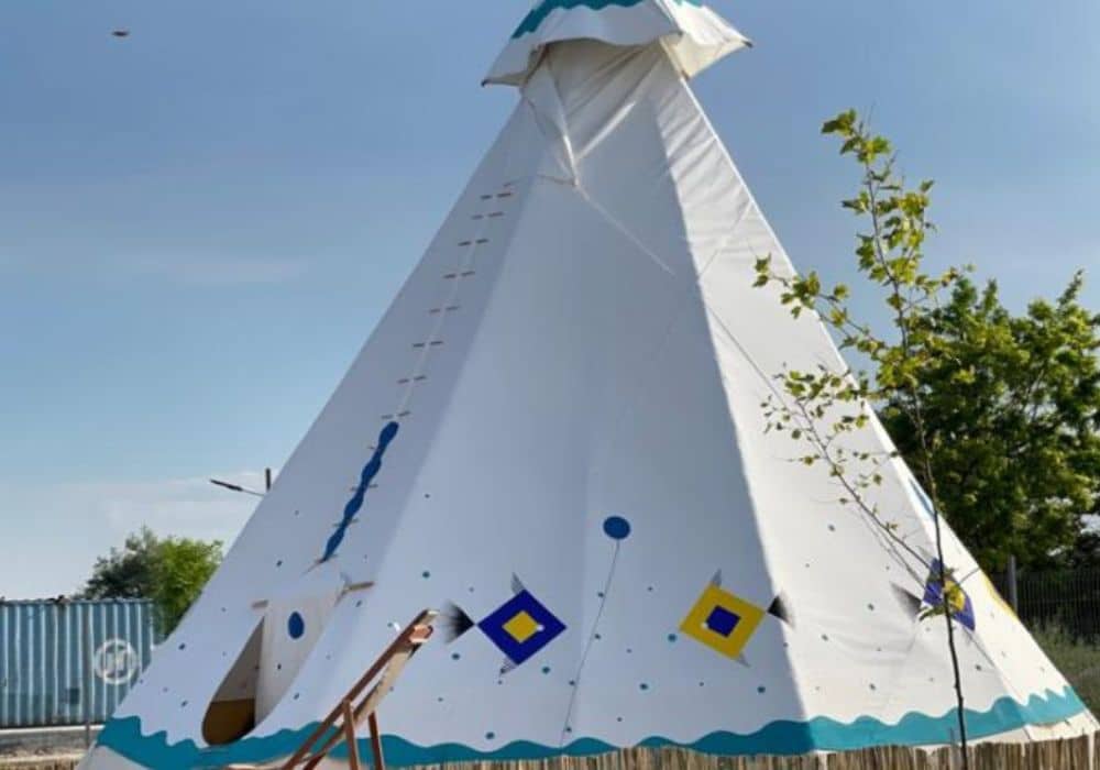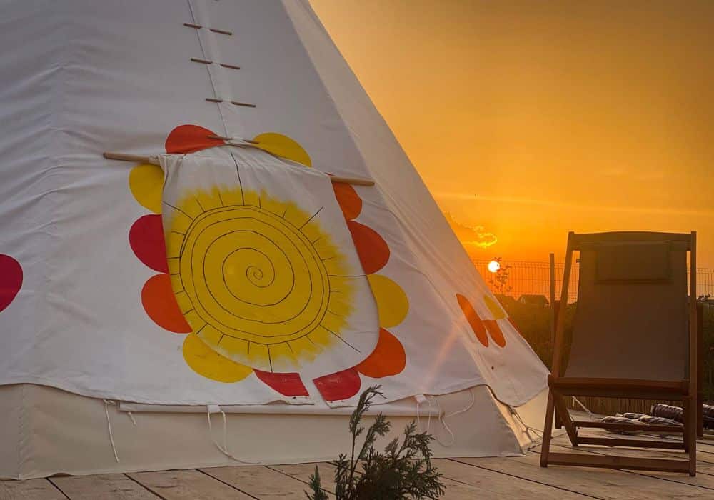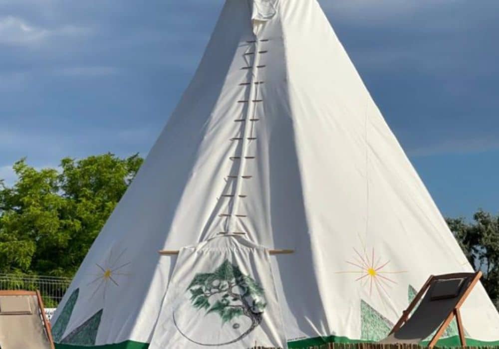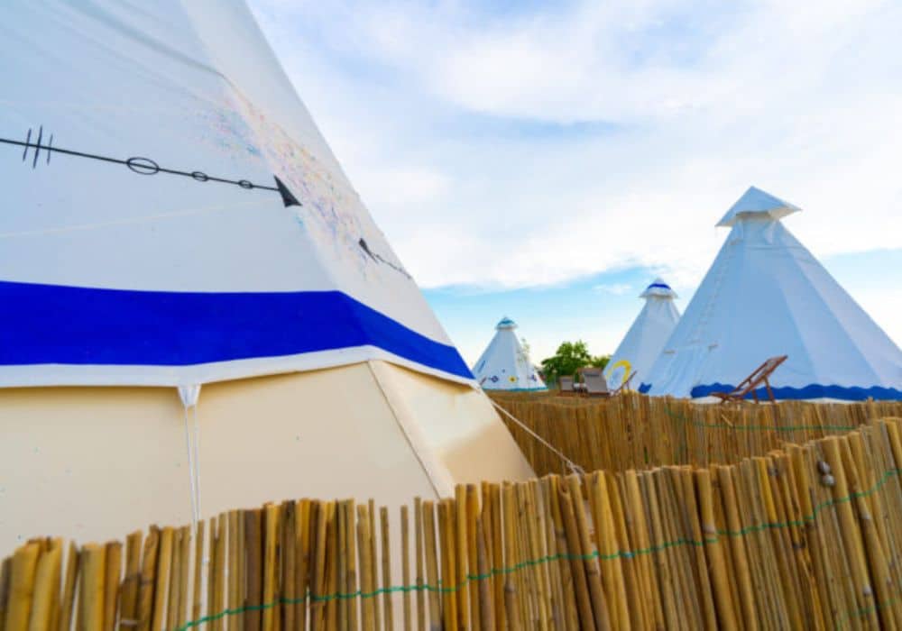 TeePee tents are full of tradition and charm. They stand on their own wooden platforms and are surrounded by green grass. The cone-shaped design, which was inspired by the Amerindians, shows how people have always been connected to nature.