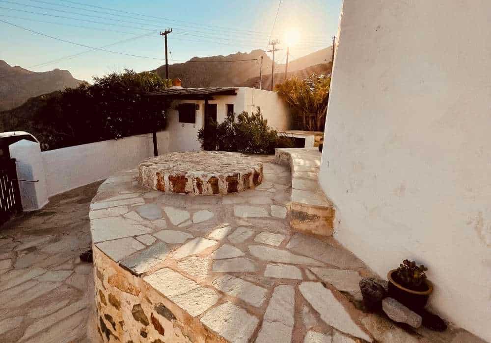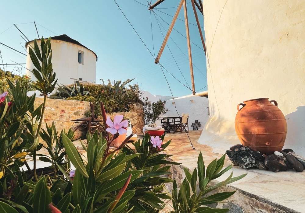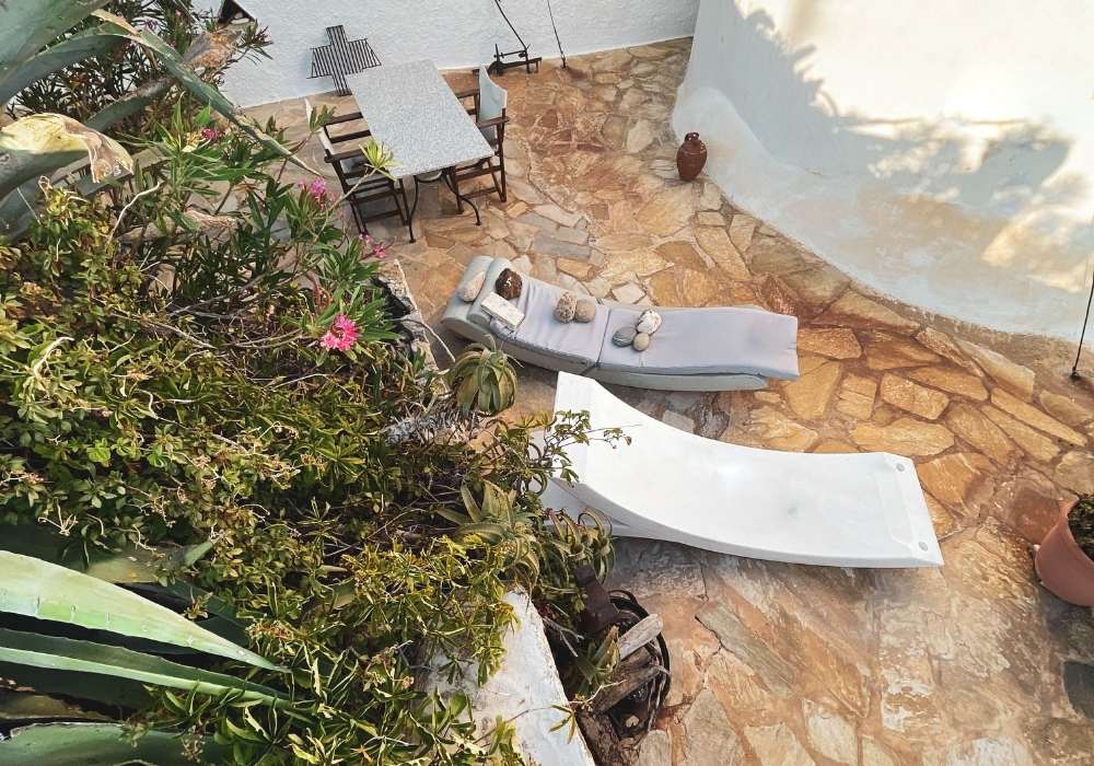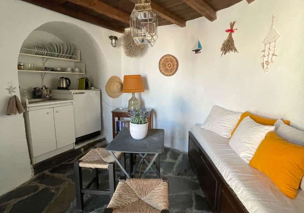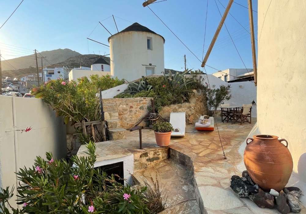 In the heart of Serifos Town in the most prominent position, Windmill Serifos is the first of a series of windmills. It’s beautiful, sturdy and imposing round building, with a traditional conical thatched roof. The windmill was renovated in the 90’s and has been converted into a three-level holiday home, retaining many of its traditional elements, offering a unique living experience. It’s special shape and wide walls provide a unique feeling of tranquillity and security. Divided into 3 levels, the ground floor houses a fully equipped kitchenette suitable for light meals and breakfasts, the next level has the bedroom and the bathroom while on the upper level there is a spacious living are. On the outside The Windmill Serifos provides a private patio with sun loungers and a seating area. *For safety reasons, due to the very stir stairs, children under the age of 15 are not allowed.