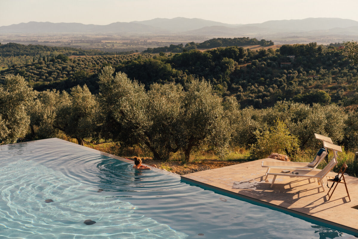 Der große Infinity-Pool im Olivenhain neben dem Hauptgebäude, in dem sich auch die Rezeption befindet, lädt zur Erfrischung an heißen Tagen oder zum Verweilen nach einem Ausflug ein. Von hier aus genießt man einen fantastischen Blick auf die Maremma.