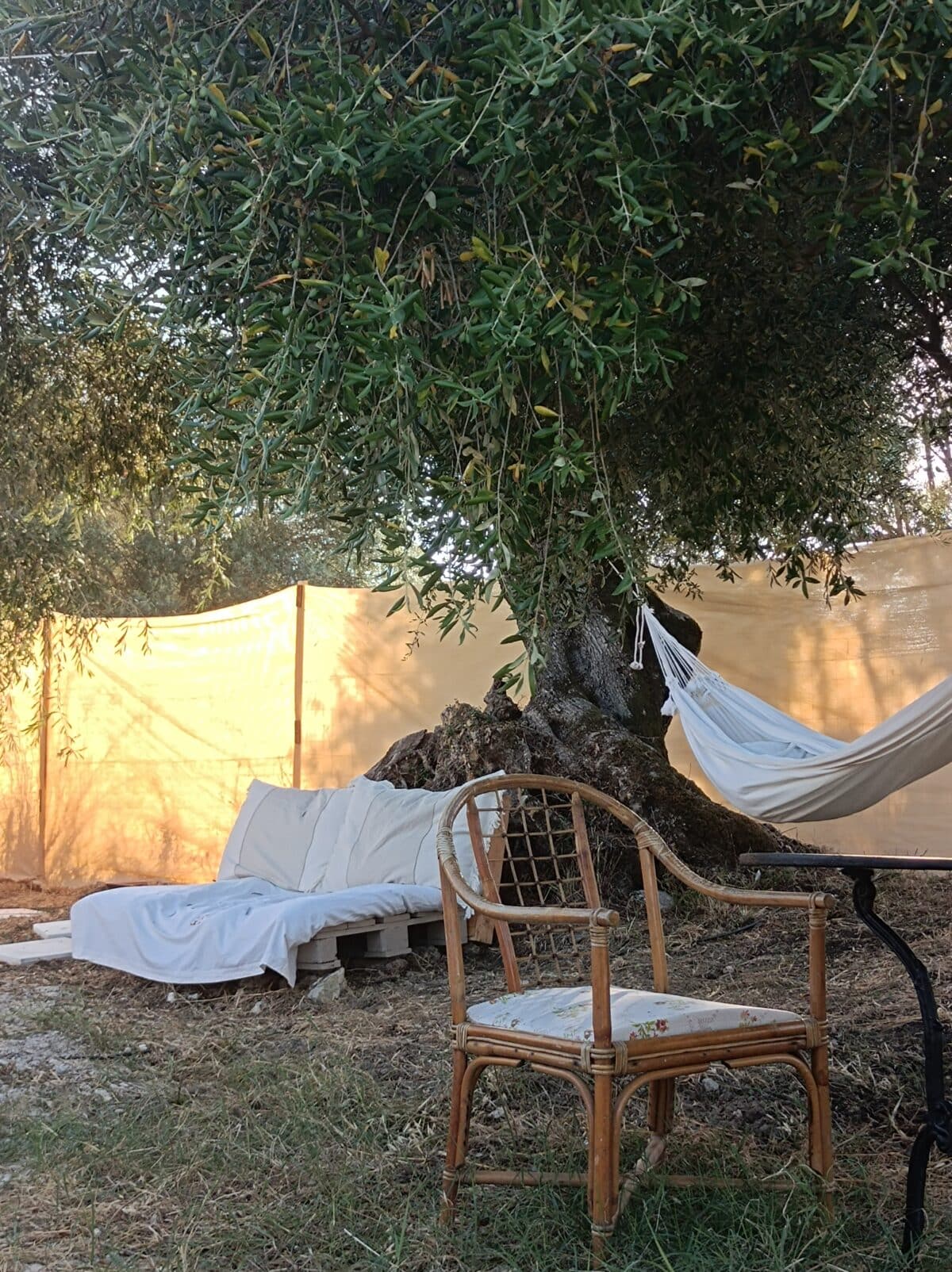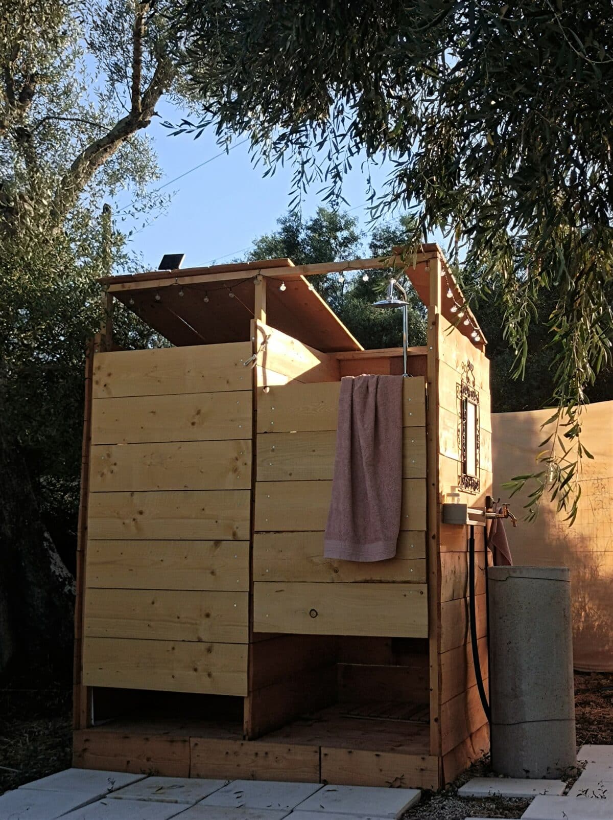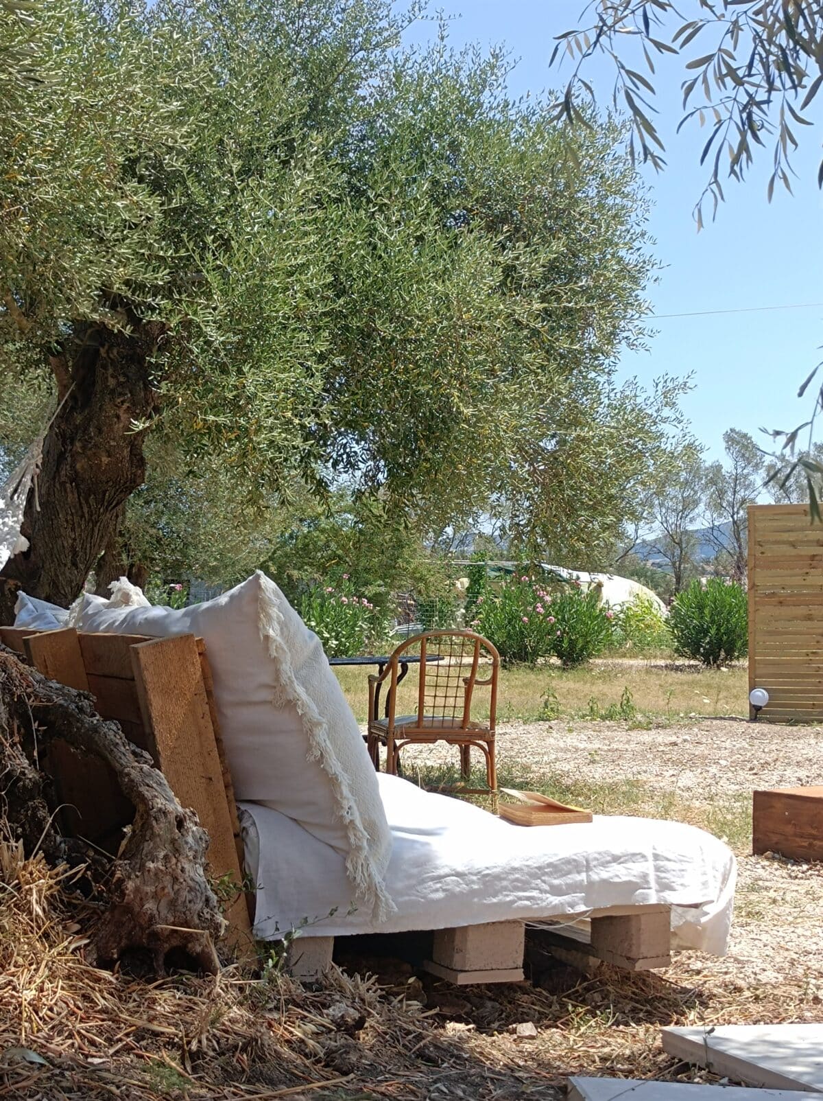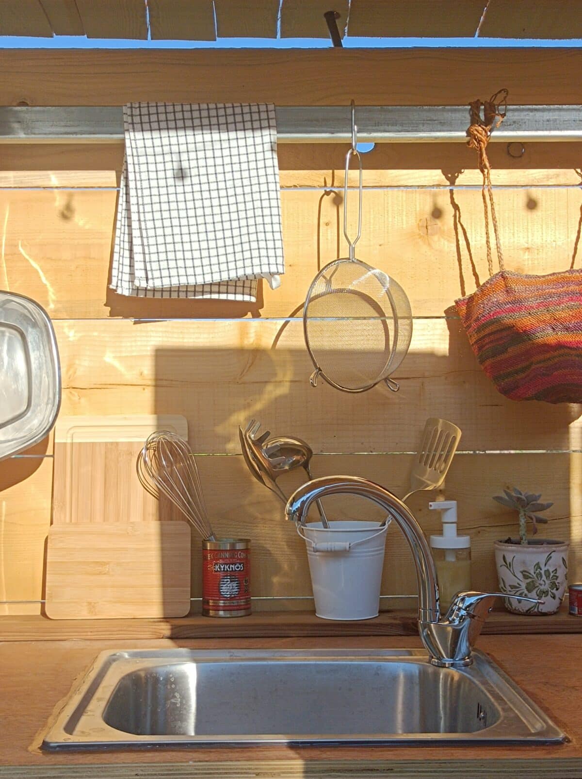 Υπάρχει ένα διπλό (160) και δύο μονά κρεβάτια και η δυνατότητα προσθήκης ενός επιπλέον στρώματος. Η κουζίνα είναι εξοπλισμένη με μικρό ψυγείο και κουζίνα με μπουκάλια αερίου. To μπάνιο αποτελείται από τουαλέτα κομποστοποίησης, ντους και εξωτερικό νιπτήρα. Διαθέτει αιώρα και καναπέ κάτω από τα ελαιόδεντρα για ξεκούραση.