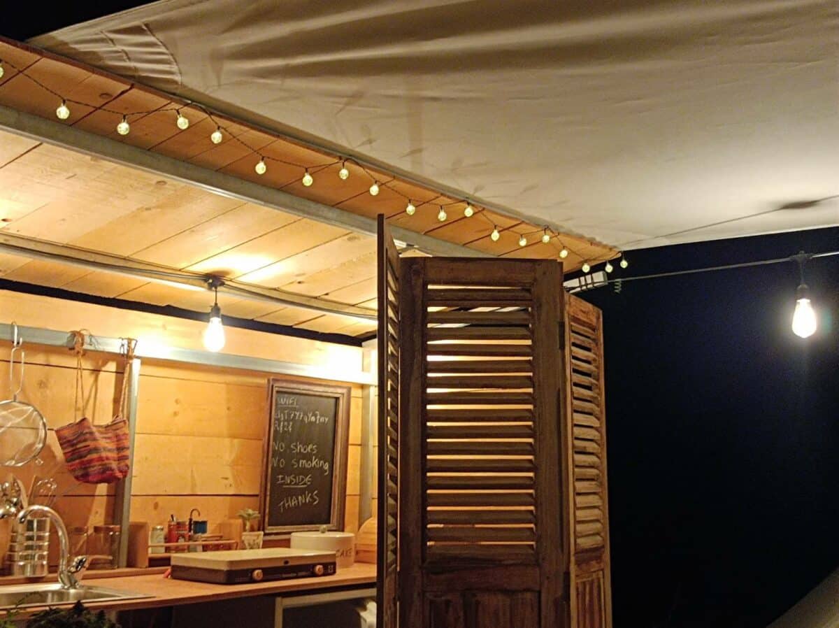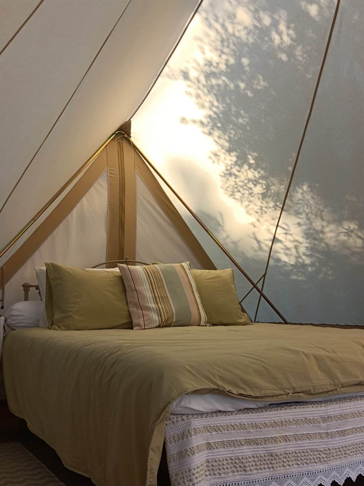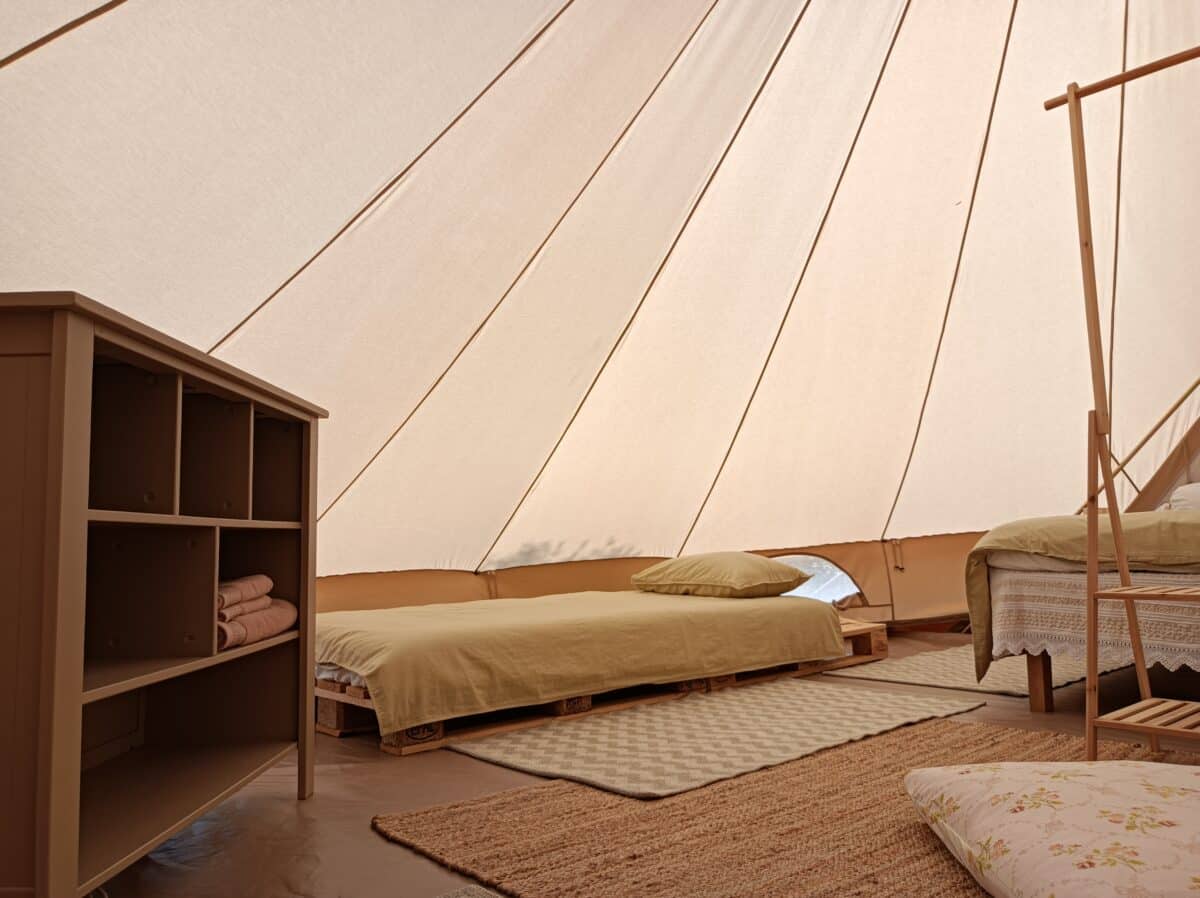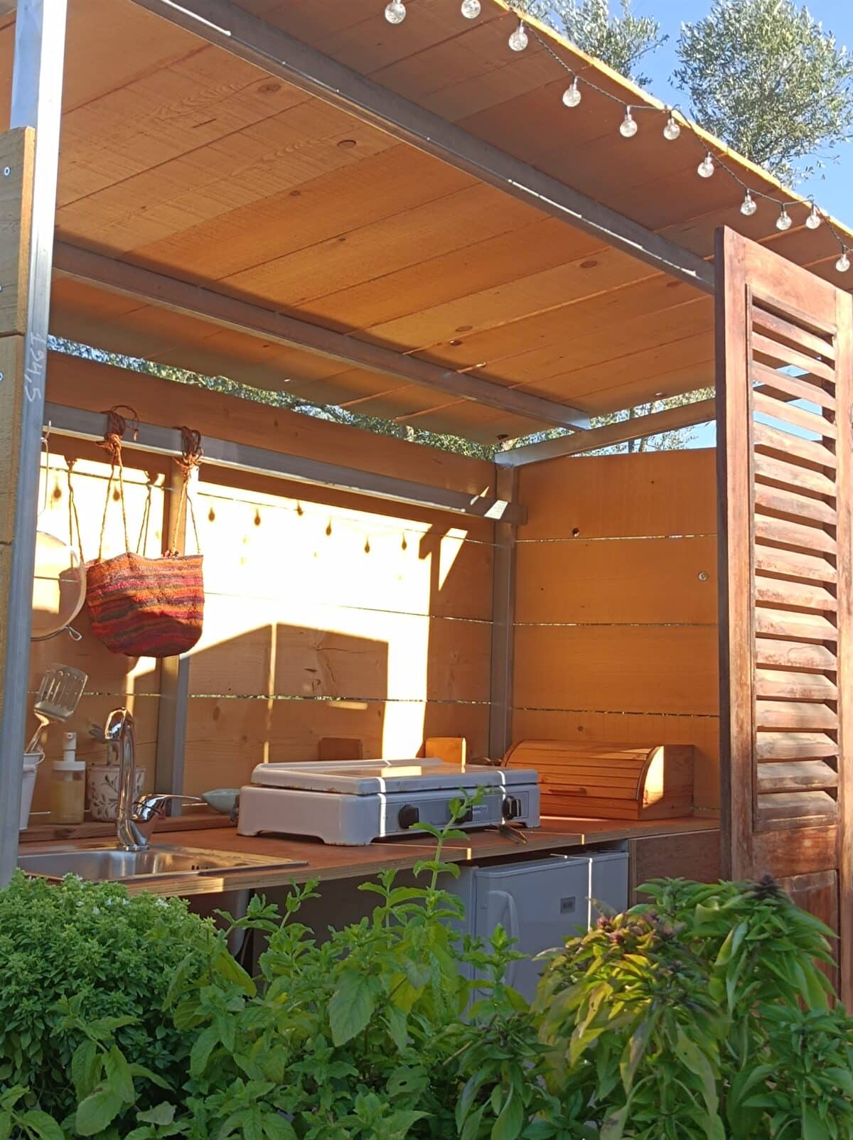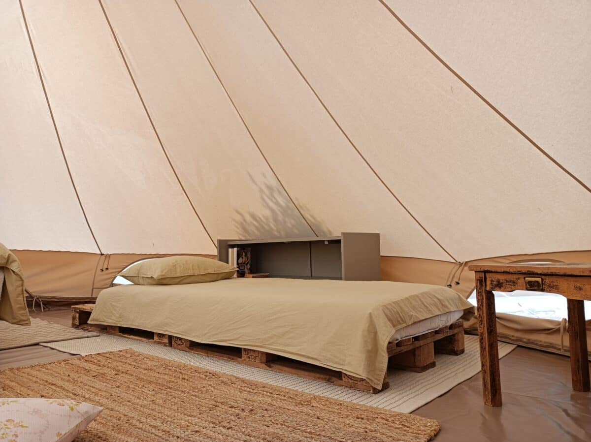 Υπάρχει ένα διπλό (160) και δύο μονά κρεβάτια και η δυνατότητα προσθήκης ενός επιπλέον στρώματος. Η κουζίνα είναι εξοπλισμένη με μικρό ψυγείο και κουζίνα με μπουκάλια αερίου. To μπάνιο αποτελείται από τουαλέτα κομποστοποίησης, ντους και εξωτερικό νιπτήρα. Διαθέτει αιώρα και καναπέ κάτω από τα ελαιόδεντρα για ξεκούραση.