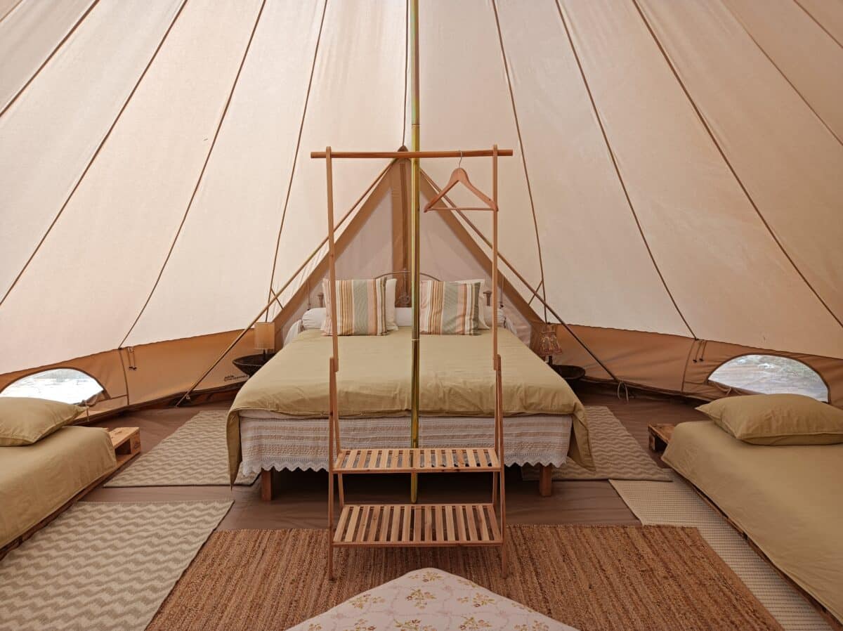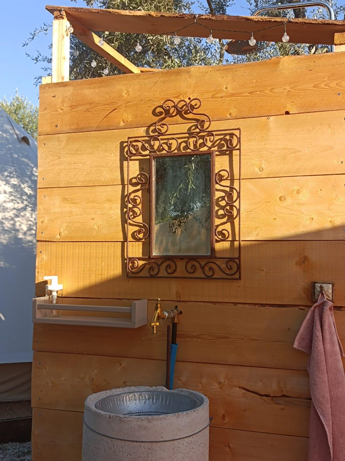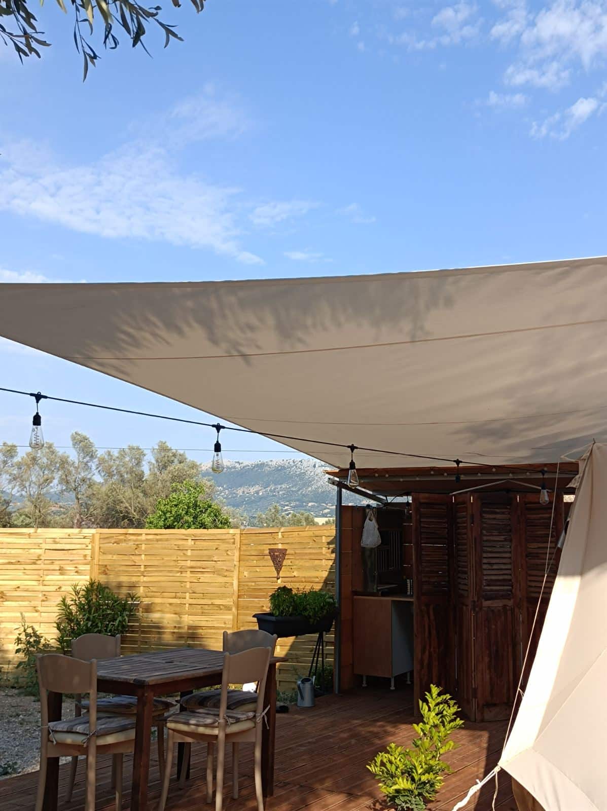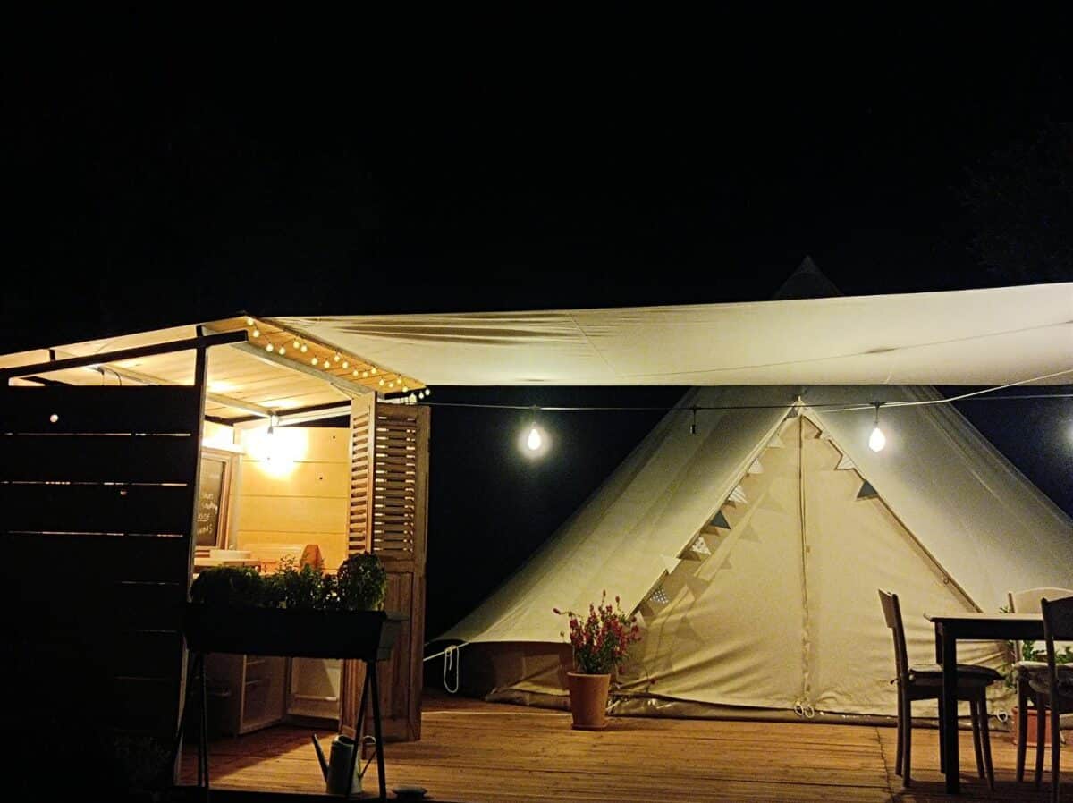 Η σκηνή μας βρίσκεται στην είσοδο του οικοπέδου μας και 30 μέτρα από το σπίτι μας. Είναι 28 τ.μ. και μπορεί να φιλοξενήσει μέχρι τέσσερα άτομα. Διαθέτει υπαίθρια κουζίνα, υπαίθριο μπάνιο και χώρο χαλάρωσης. Υπάρχει χώρος στάθμευσης. Βρίσκεται στην ύπαιθρο, 1 χλμ. από τα καταστήματα και 4 χλμ. από την πόλη της Λευκάδας. Σε απόσταση 1 χλμ. μπορείτε επίσης να απολαύσετε μια ωραία βόλτα στις αλυκές Αλεξάνδρου και ένα δροσερό μπάνιο στην παραλία τους.