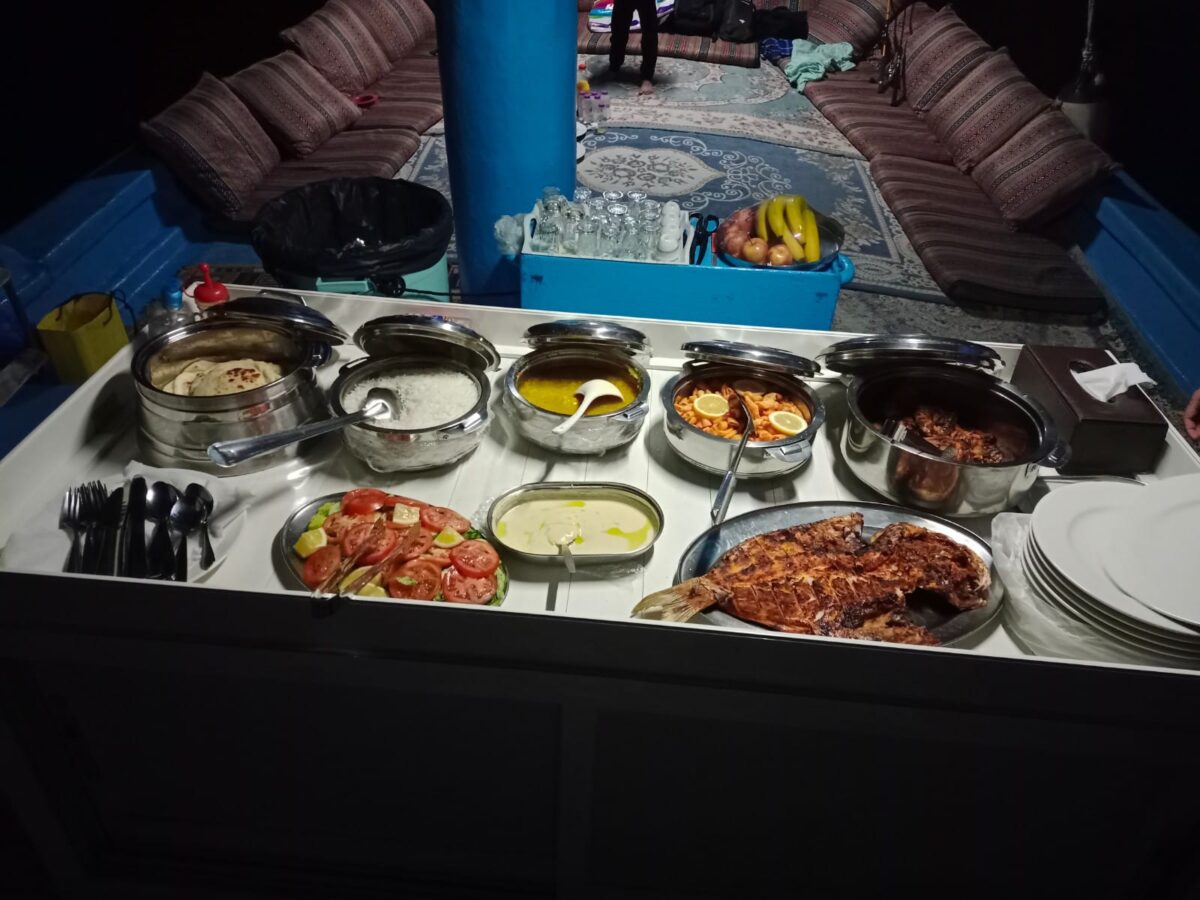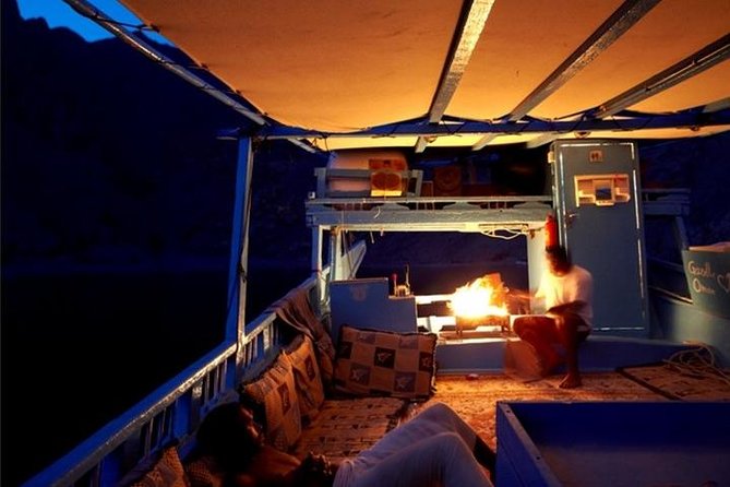 Pase la noche en nuestro dhow tradicional omaní, que fondeará en un lugar tranquilo de Khor Sham. Disfrute de tiempo libre desde las 16:30 hasta la puesta de sol para nadar, bucear o pescar. Nuestro capitán y la tripulación prepararán una cena a la barbacoa, que se servirá hacia las 19:30. Duerma en la cubierta bajo las estrellas, con colchones, sábanas, almohadas y sacos de dormir o mantas proporcionados. Disfrute de una cena barbacoa y del desayuno en el dhow.