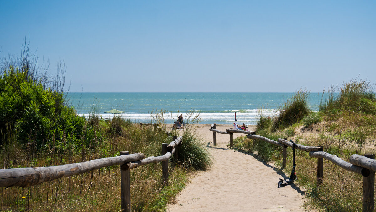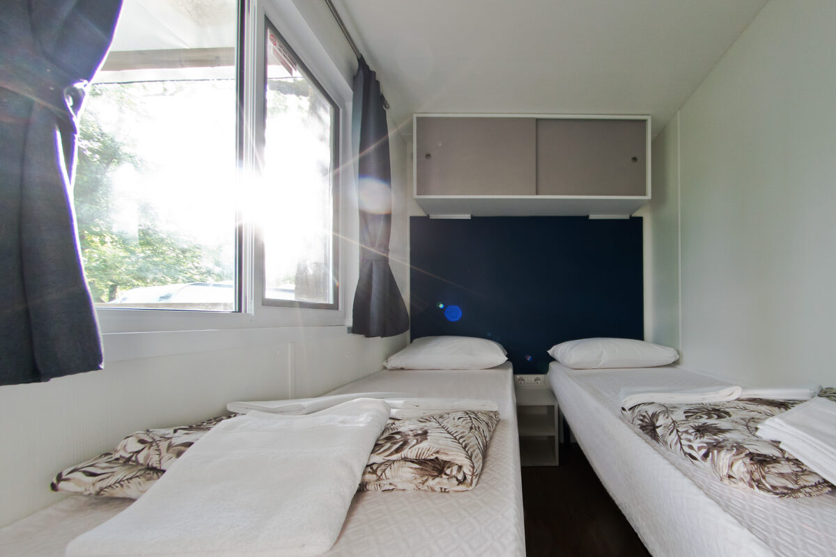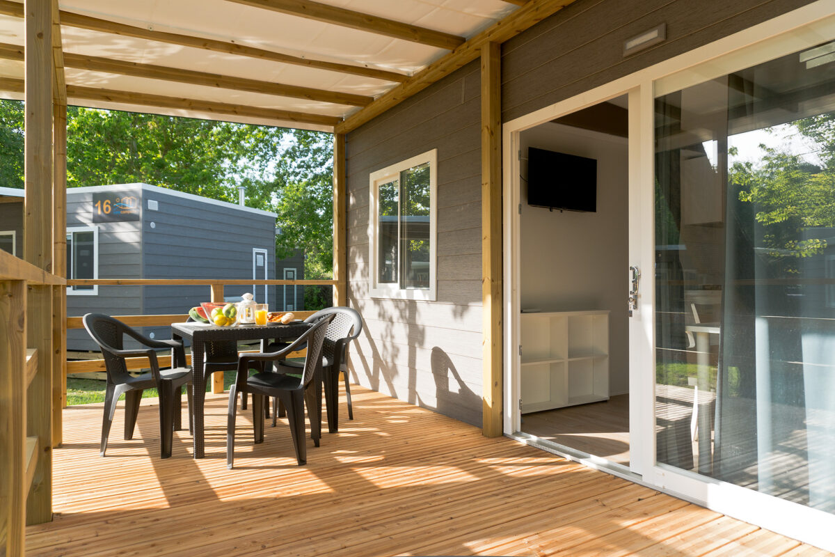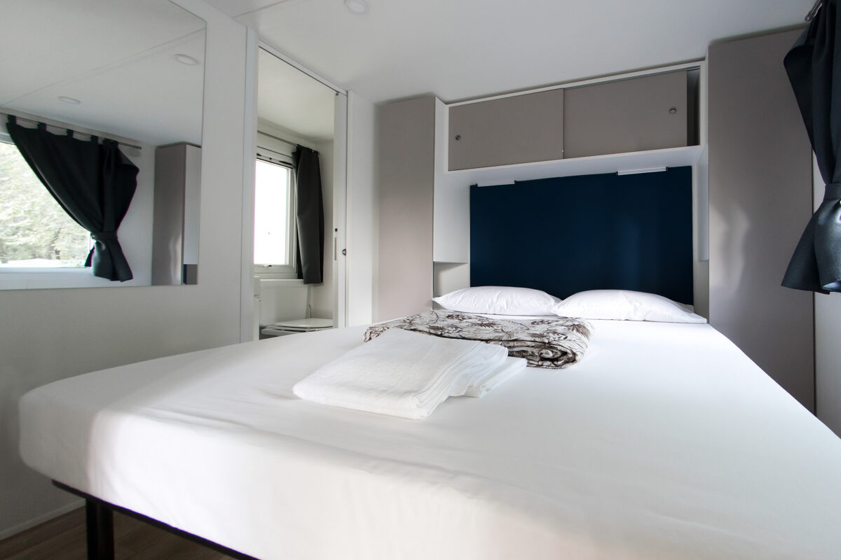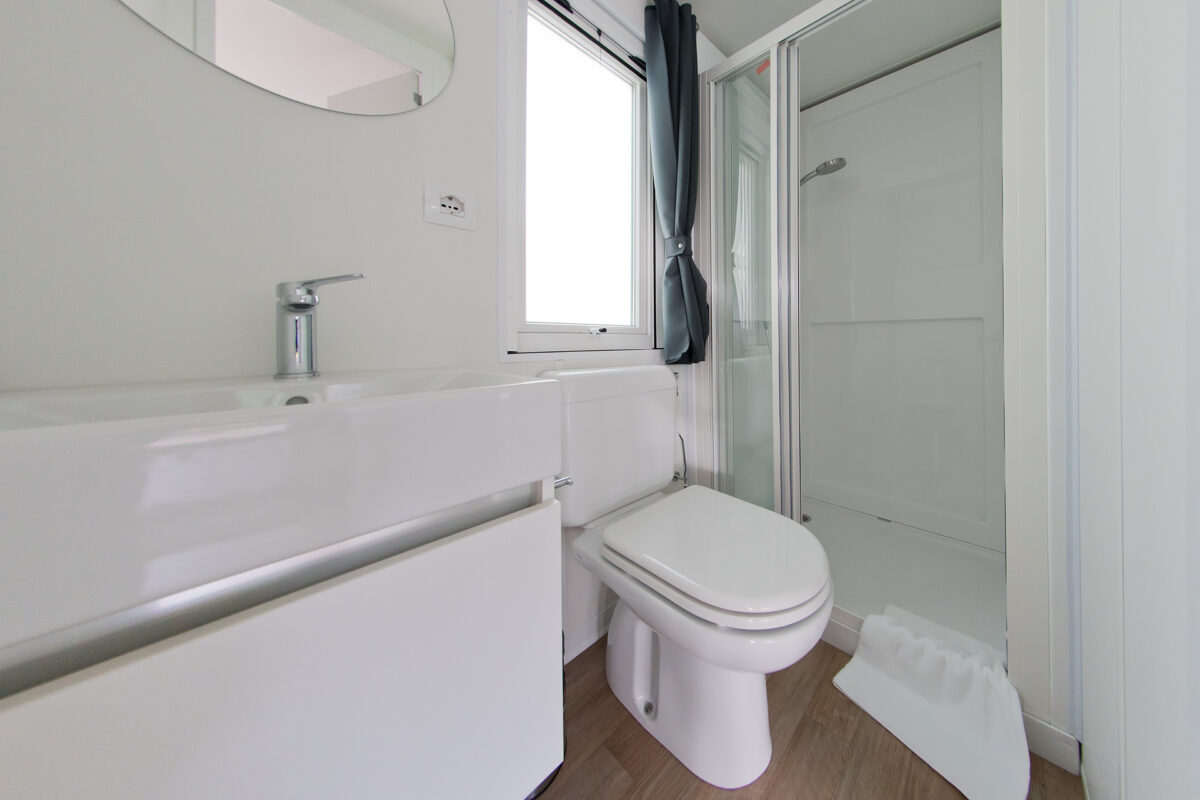 El camping Ca'Savio está situado en la península de Cavallino, que separa la laguna veneciana del mar Adriático, a las afueras del pueblo de Ca'Savio, entre Lido di Jesolo y Punta Sabbioni. Está rodeado por un antiguo pinar. El camping está situado directamente en la amplia playa de arena con aguas cristalinas. Mobile Home PREMIUM MAXI Tiene aproximadamente 31 metros cuadrados y puede alojar hasta 6 personas. Consta de: dormitorio doble con baño propio (inodoro, ducha y lavabo); dos dormitorios con dos camas individuales; cuarto de baño (inodoro, ducha y lavabo); sala de estar con cocina americana. En el salón, la zona de estar se puede utilizar como zona de dormitorio adicional para 1 persona. También hay mesa con sillas y cocina americana totalmente equipada (vajilla completa). En el exterior hay una terraza cubierta de madera con muebles de jardín (mesa y sillas).
