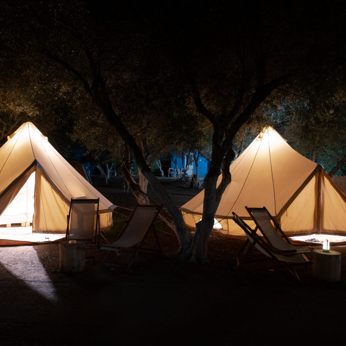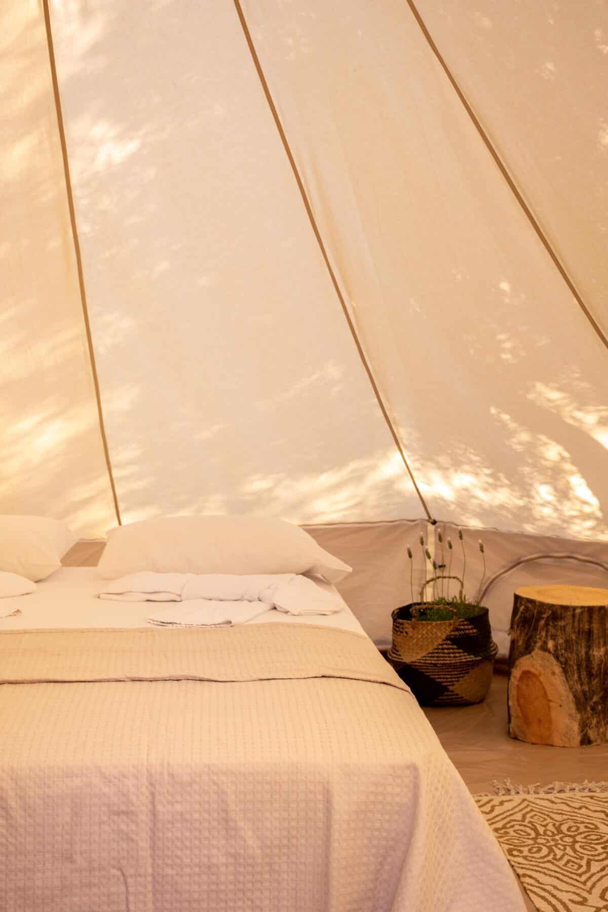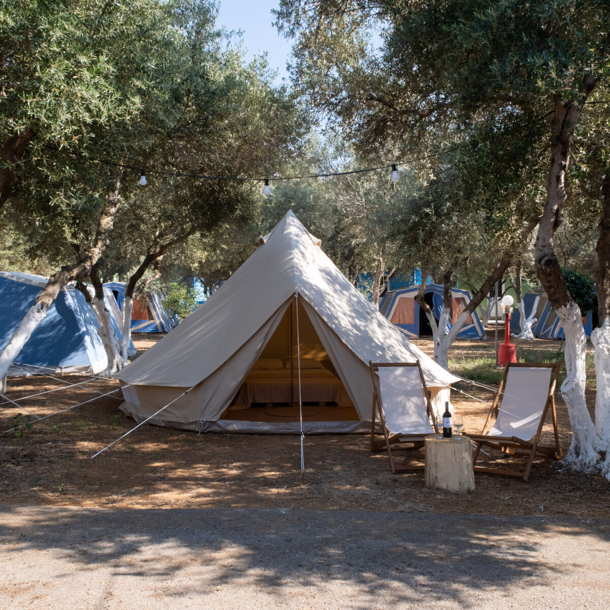 La nostra ultima novità è la tenda in tela Glamping , realizzata in tela di cotone al 100%. Possono raggiungere un'altezza massima di 3 metri e hanno una circonferenza di 4,5 metri. Le nostre tende a campana hanno un proprio quartiere e sono situate in una zona unica del campeggio. Possono ospitare tre persone e hanno l'ombra ideale dei nostri ulivi. Le tende hanno un letto matrimoniale, o un letto matrimoniale e un letto singolo, oltre a uno spazio per sedersi. Dispongono inoltre di elettricità, piccolo frigorifero, ventilatore e stoviglie. Sono inoltre incluse coperte e lenzuola.
