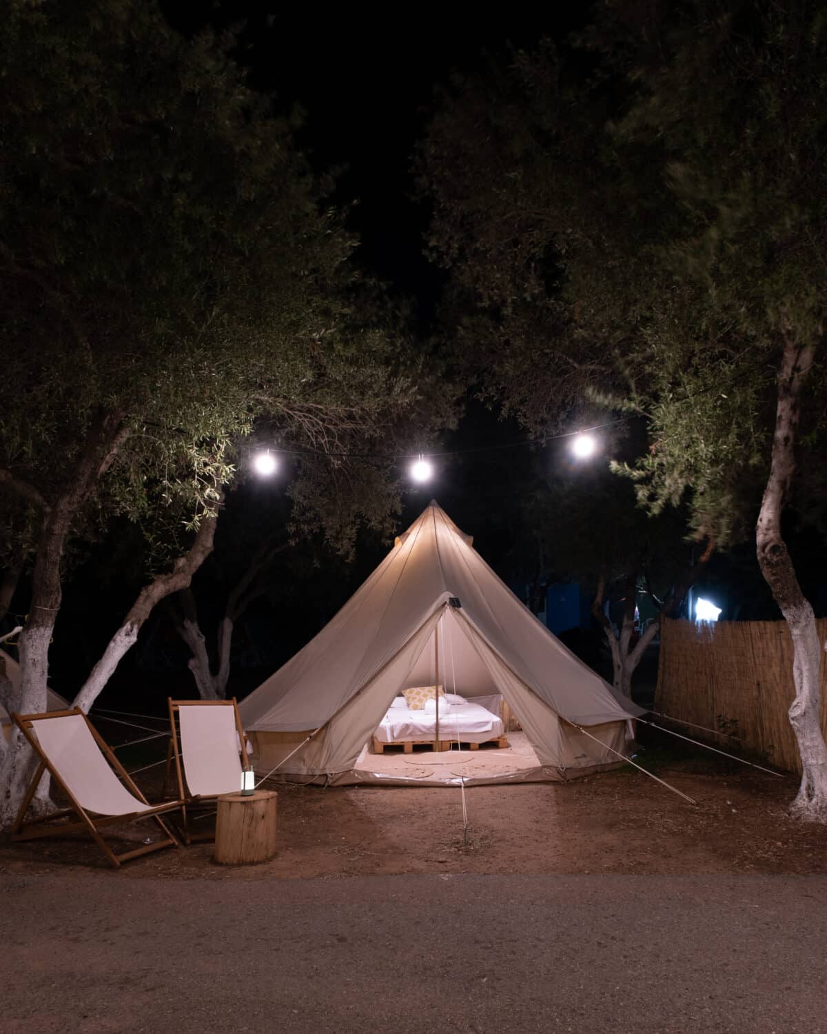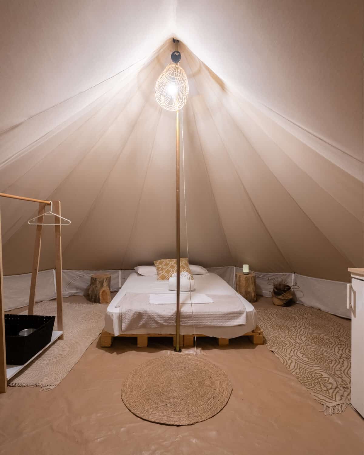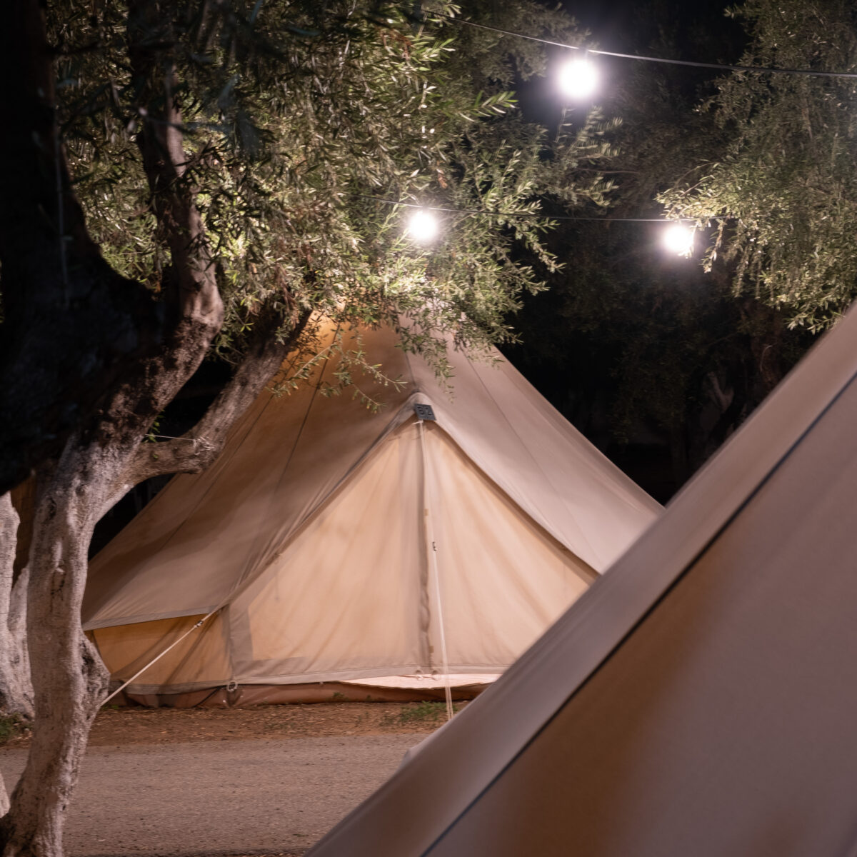 La nostra ultima novità è la tenda in tela Glamping , realizzata in tela di cotone al 100%. Possono raggiungere un'altezza massima di 3 metri e hanno una circonferenza di 4,5 metri. Le nostre tende a campana hanno un proprio quartiere e sono situate in una zona unica del campeggio. Possono ospitare tre persone e hanno l'ombra ideale dei nostri ulivi. Le tende hanno un letto matrimoniale, o un letto matrimoniale e un letto singolo, oltre a uno spazio per sedersi. Dispongono inoltre di elettricità, piccolo frigorifero, ventilatore e stoviglie. Sono inoltre incluse coperte e lenzuola.