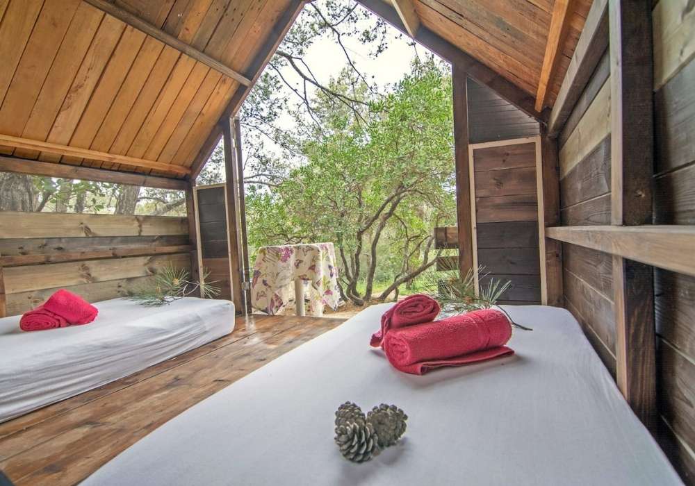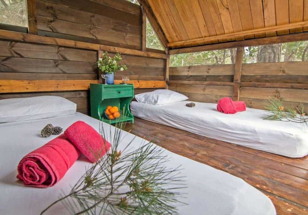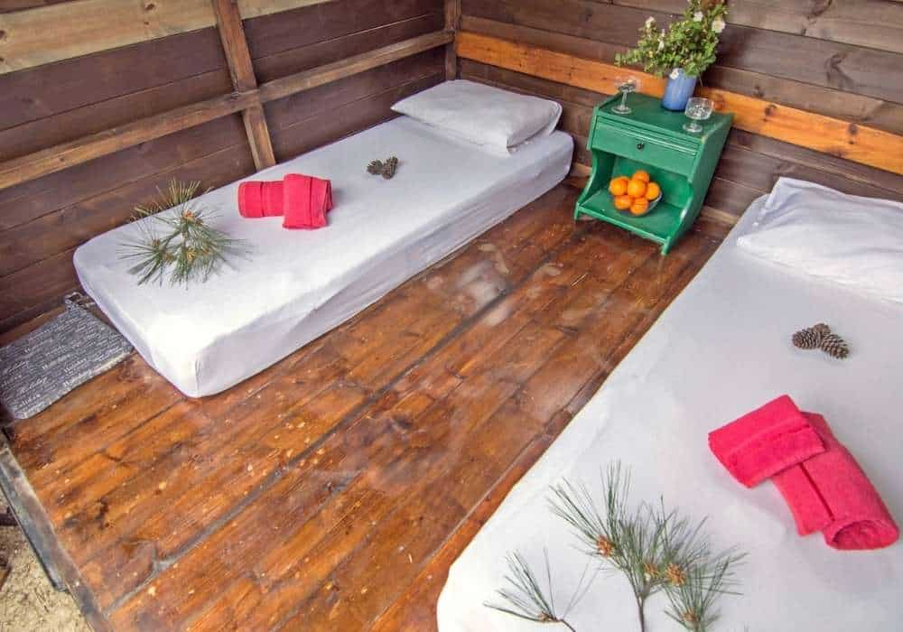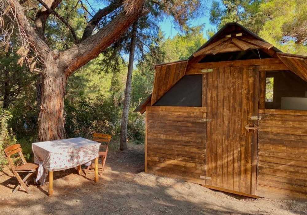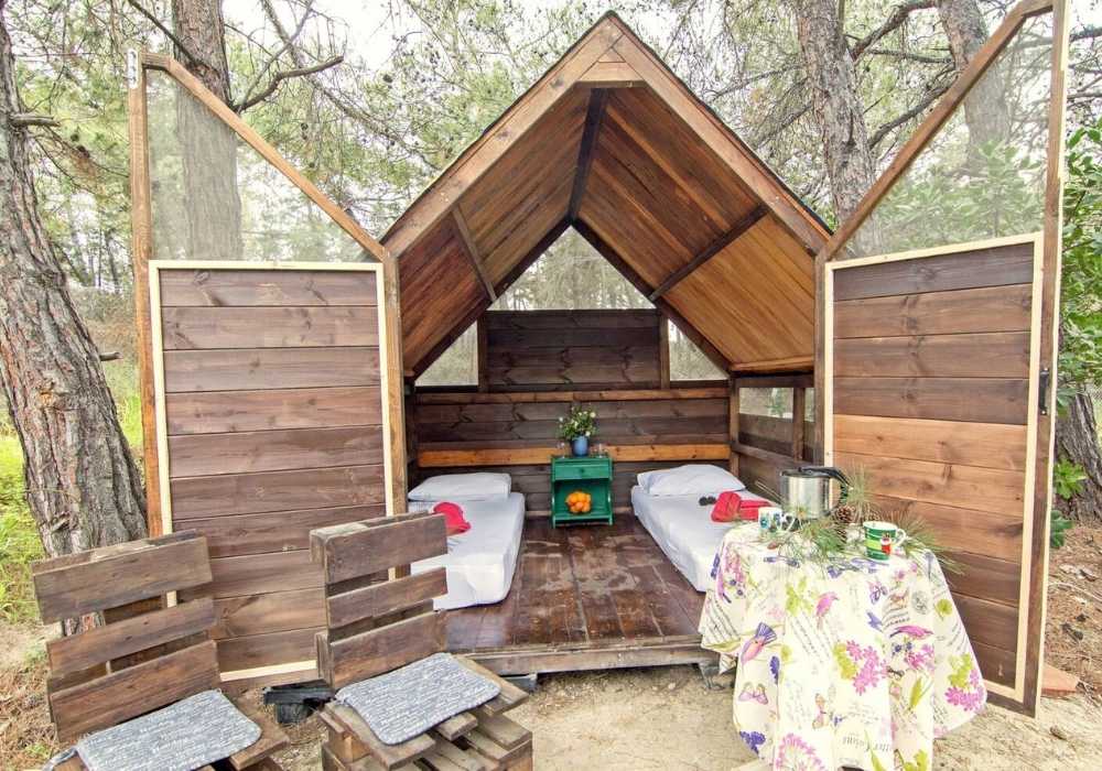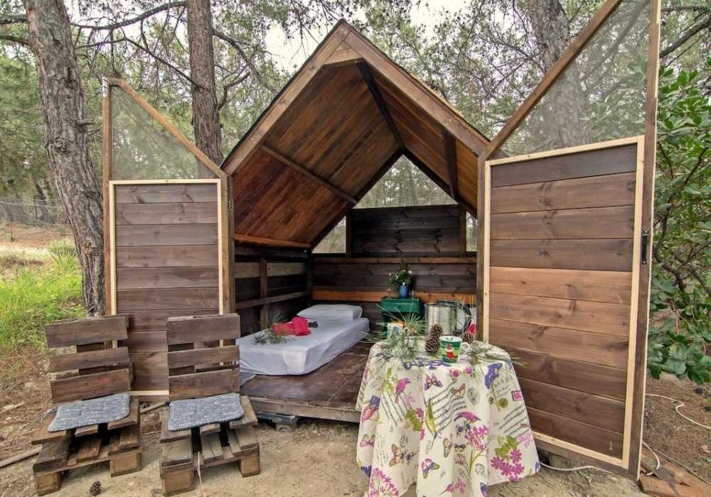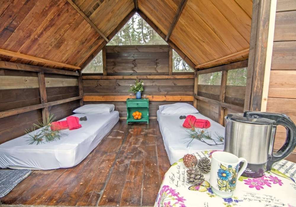 Deze plek is geïsoleerd van het lawaai van de zomer, maar tegelijkertijd overal dichtbij. De hut ligt in een dennenbos. Het kleine bos met hangmatten, de gemeenschappelijke ruimte met schaduw van druivenranken en de zomerbries maken het verblijf zeer comfortabel.