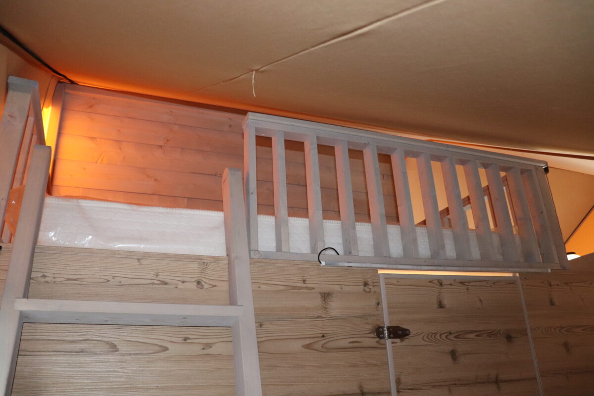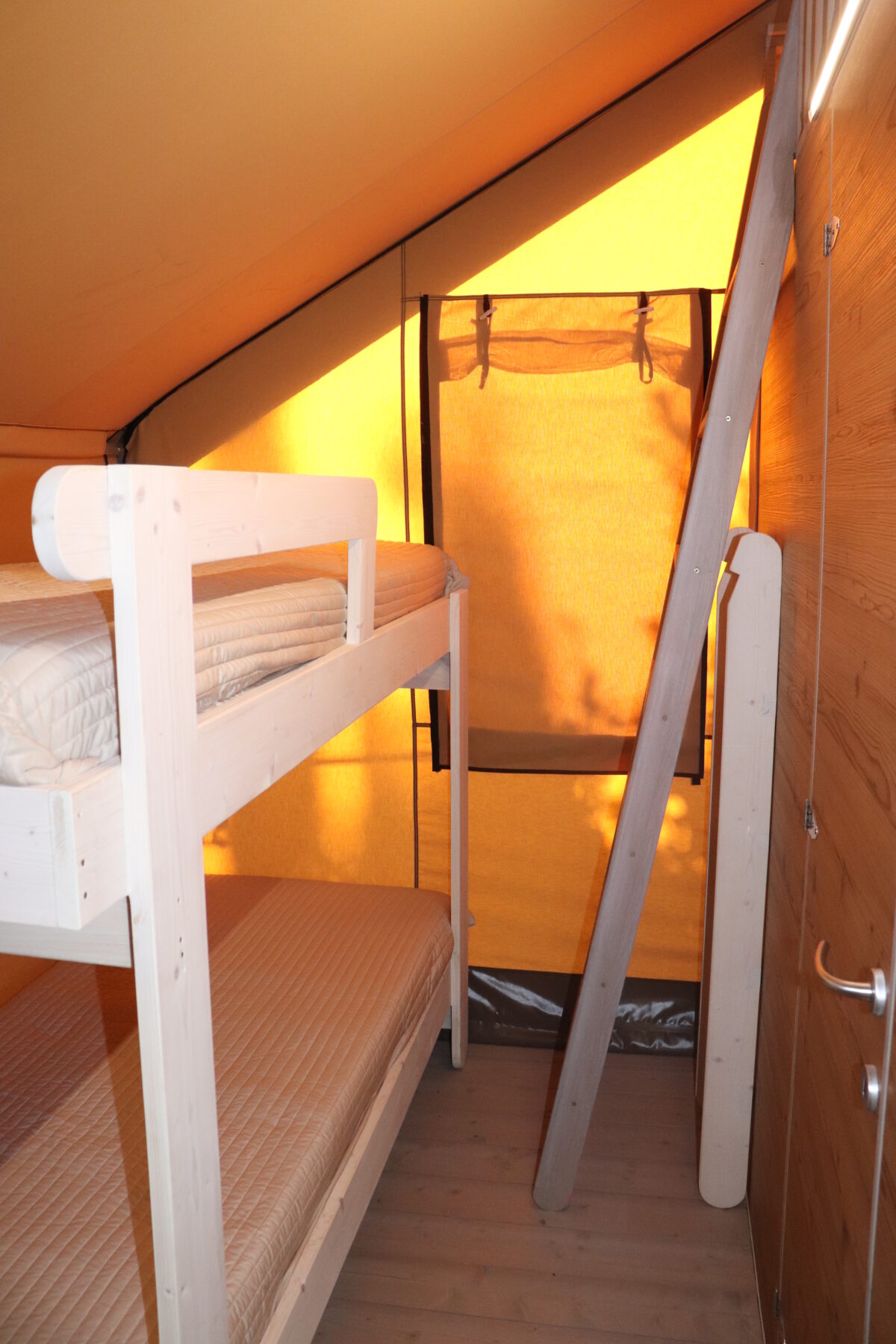 Indeling: slaapkamer 160×190 met kleerhangers; slaapkamer met 2 stapelbedden 80×190 elk en hoogslaper met kleerhangers; woonkamer met kleerhangers en futon tweepersoonsslaapbank 160, 190; kitchenette uitgerust met inductiekookplaten, gootsteen, koelkast, onderbouw; groot terras van 16 m² ongeveer.