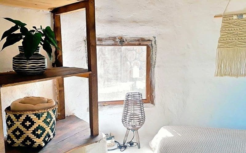 Binnen: 1 tweepersoonsbed, bank, planken.
